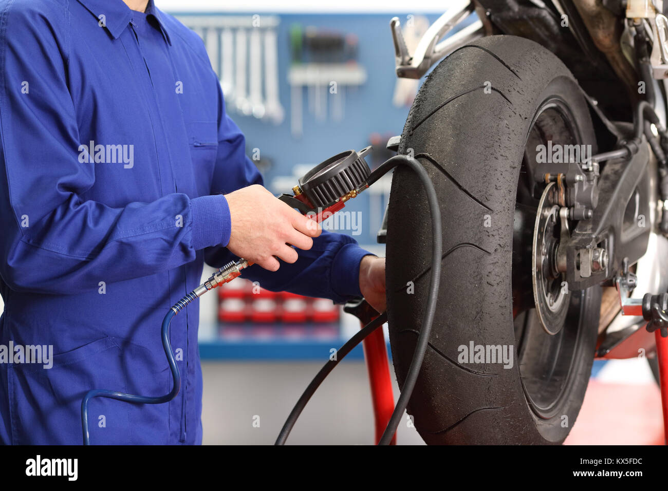 Close Up Di Una Moto Meccanico Di Controllo A Mano Pneumatici Aria Con Un Manometro In Un Workshop Foto Stock Alamy