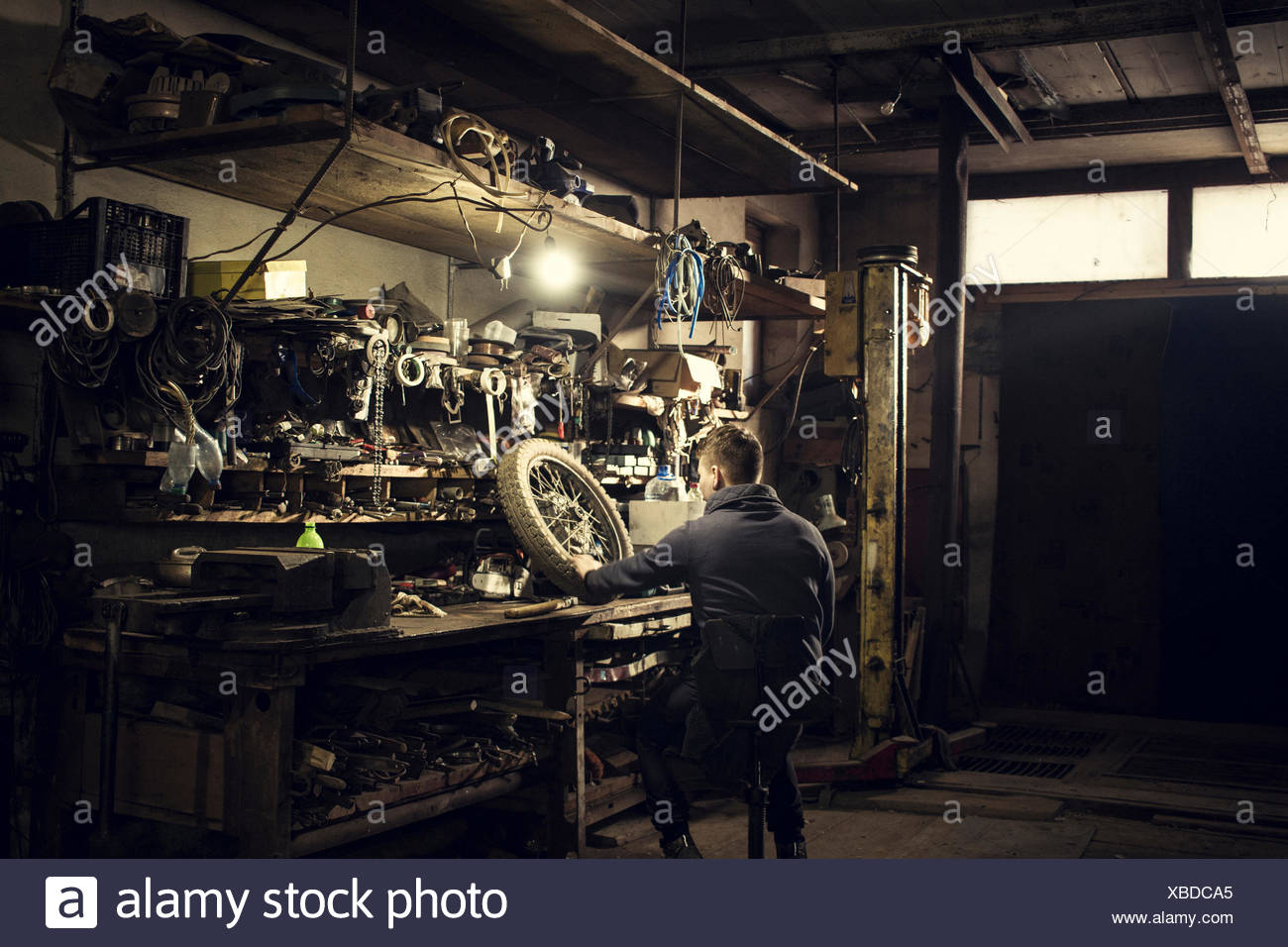 Riparazione Meccanica Vintage Ruota Di Moto Al Banco Di Officina Foto Stock Alamy