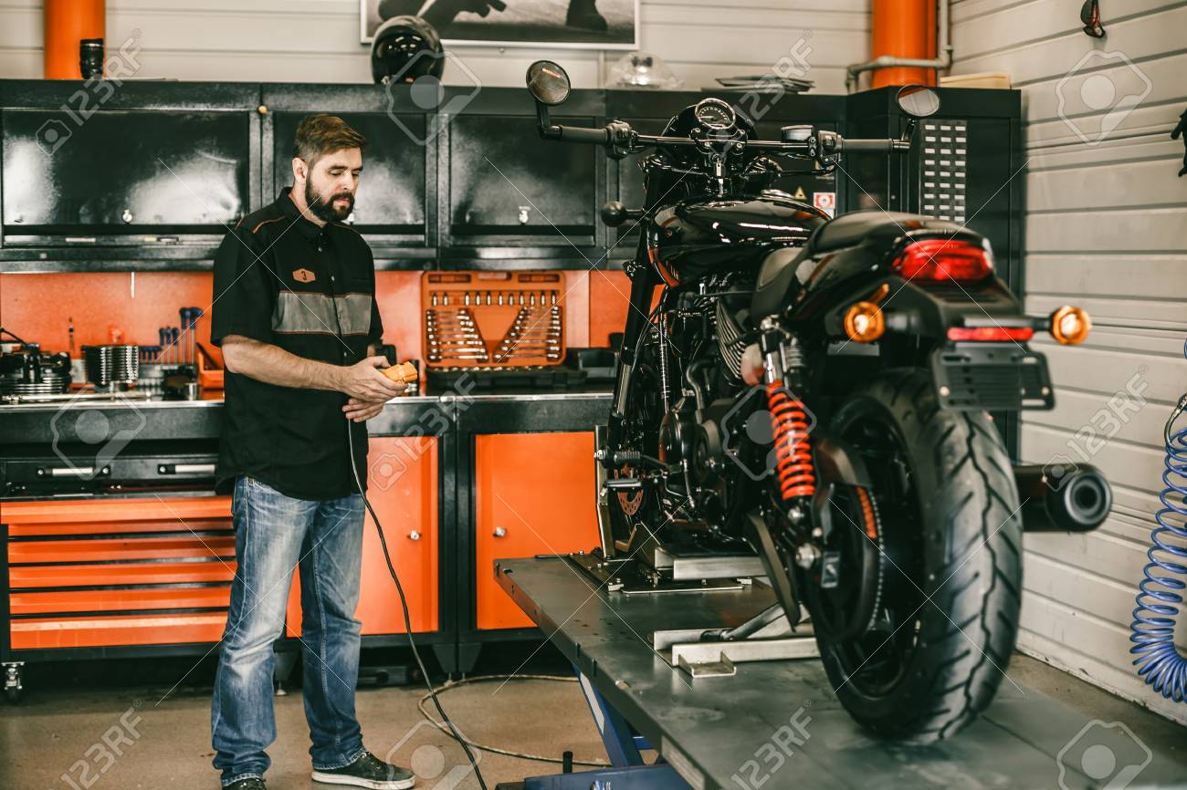 Immagini Stock Il Meccanico Di Moto Professionista Alza Una Moto Sull Ascensore Uomo Premendo Su E Giu Interruttore In Officina Della Bici Image
