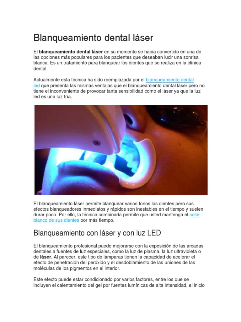 El blanqueamiento dental es uno de los procedimientos estéticos más solicitados en los consultorios odontológicos Estos tratamientos dentales han evolucionado con el tiempo, llevando nuevas técnicas a los pacientes pasando por las pastas dentales, el láser y la luz LED fría Nuestra dentadura puede perder su color natural por diferentes causas entre las que encontramos el consumo de. Blanqueamiento Dental con Láser;. Los riesgos del blanqueamiento dental ¿Está pensando en blanquear sus dientes?.