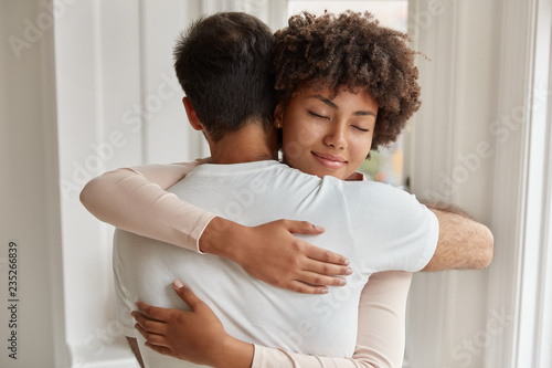 Back View Of Caucasian Guy Embraces Her Girlfriend Stand Closely To Each Other Express Love And Support Comfort Express Empathy Have Good Relations People Care And Relationship Concept Buy This Stock