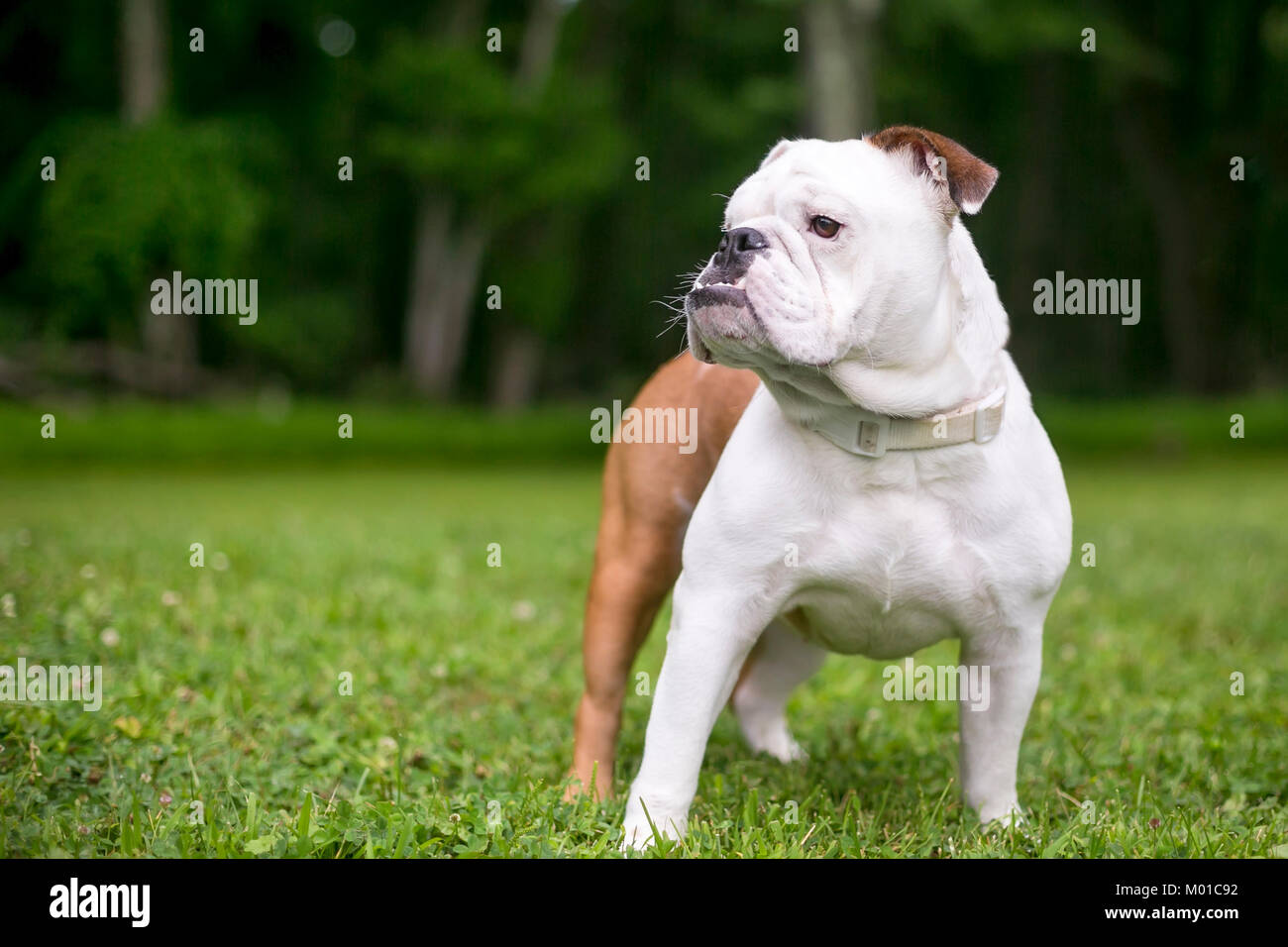 Un Bianco E Marrone Di Bulldog Inglese Con Un Underbite All Aperto In Erba Foto Stock Alamy