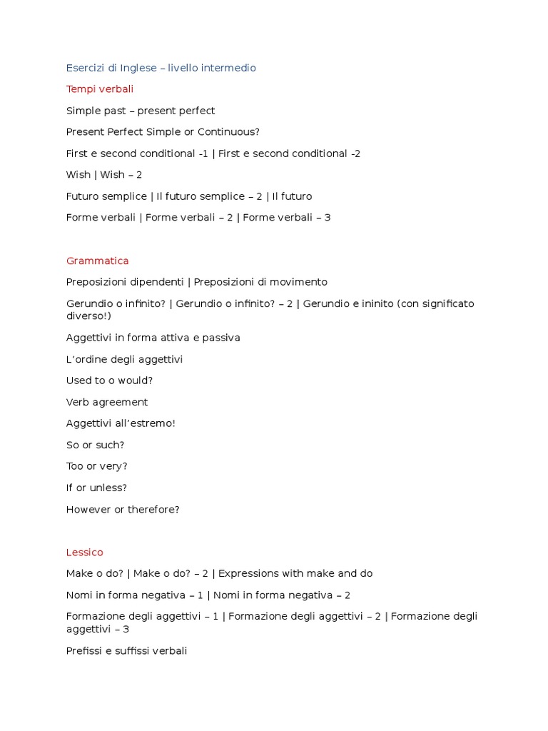 Esercizi di inglese in pdf In questa pagina puoi trovare tutti gli esercizi di inglese del sito in formato pdf facilmente scaricabili e stampabili Sono divisi sia per unità sia per corso base/intermedio/avanzato. Cerchi un sito per esercitarti con la lingua inglese , con tantissimi esercizi, lezioni di grammatica , vocaboli , letture e tanto ancora. Aggettivo o avverbio Esercizi visualizza le tue risposte errate In italiano male e bene sono avverbi, ma bad/good in inglese sono aggettivi) Suddenly the weather changed and within five minutes it turned Improvvisamente il tempo cambiò e nel giro di cinque minuti si abbassò la temperatura.