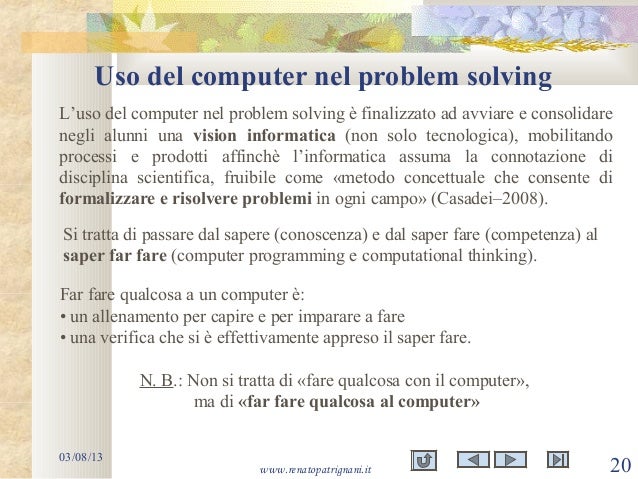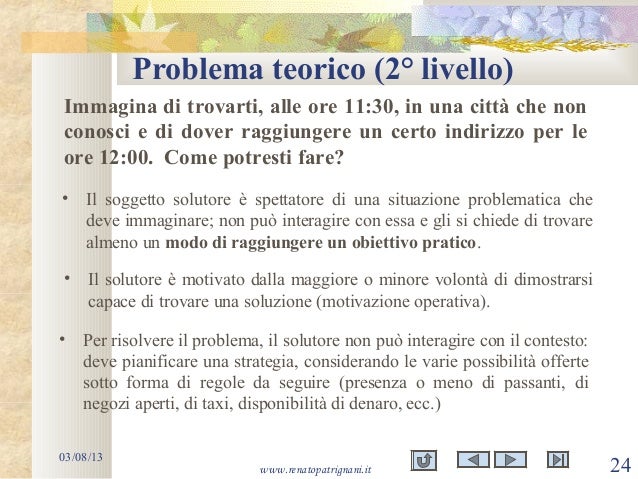 Ormai la capacità di problem solving è diventata una dicitura di prassi, spesso ininfluente per certi reclutatori che non ci trovano nulla di nuovo, accattivante, credibile e originale, anche se. Good problem solving skills empower you not only in your personal life but are critical in your professional life In the current fastchanging global economy, employers often identify everyday problem solving as crucial to the success of their organizations For employees, problem solving can be used to develop practical and creative solutions. Didattica del problem solving copia 1 03/08/13 wwwrenatopatrignaniit 1 Problem solving Problemi standard e nonstandard 2 Il problema 03/08/13 wwwrenatopatrignaniit 2 Un problema nasce quando un essere vivente ha una meta ma non sa come raggiungerla (Duncker 1935) Quindi, perché nasca un problema occorre che ci sia la motivazione a.