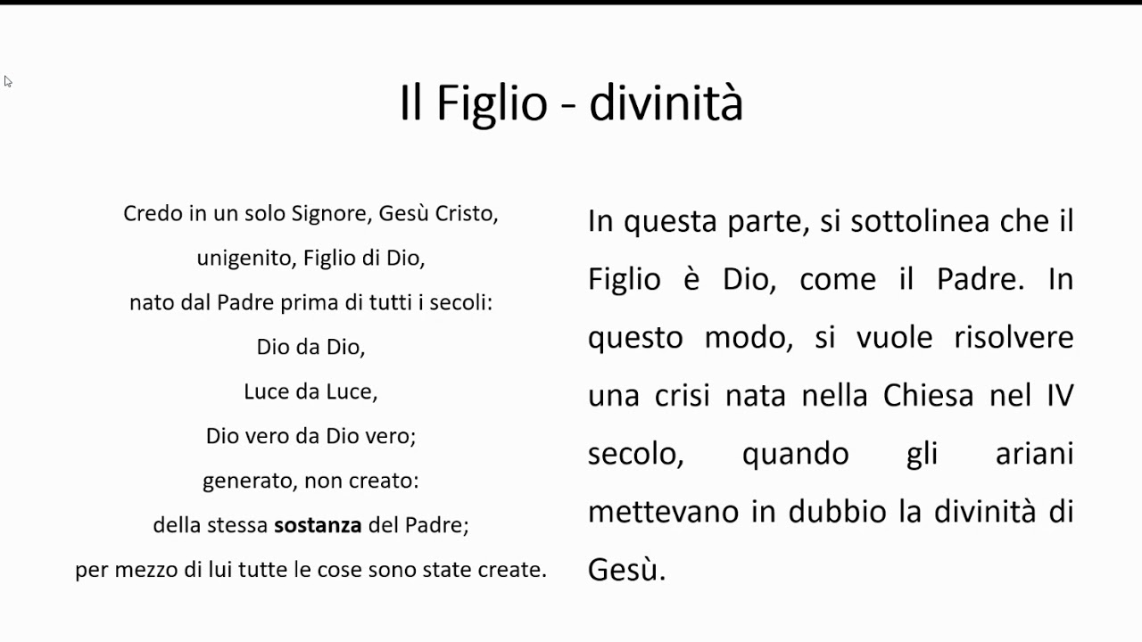 Questa è la mia fè!. Credo in un solo Dio, Padre onnipotente, Creatore del cielo e della terra, di tutte le cose visibili e invisibili Credo in un solo Signore, Gesù Cristo, unigenito Figlio di Dio, nato dal Padre prima di tutti i secoli Dio da Dio, Luce da Luce, Dio vero da Dio vero, generato, non creato, della stessa sostanza del Padre;. Credo di NiceaCostantinopoli Credo niceno in italiano Credo in un solo Dio, Padre onnipotente, Creatore del cielo e della terra, di tutte le cose visibili e invisibili Credo in un solo Signore, Gesù Cristo, unigenito Figlio di Dio, nato dal Padre prima di tutti i secoli Dio da Dio, Luce da Luce, Dio vero da Dio vero, generato, non creato,.