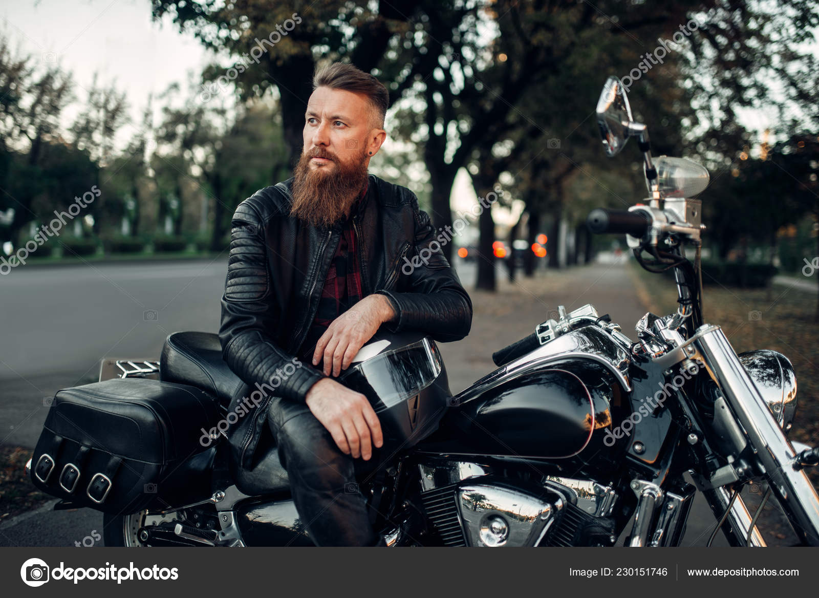 Baerded Biker Poses Chopper Leaning Helmet Vintage Bike Rider His Stock Photo C Nomadsoul1