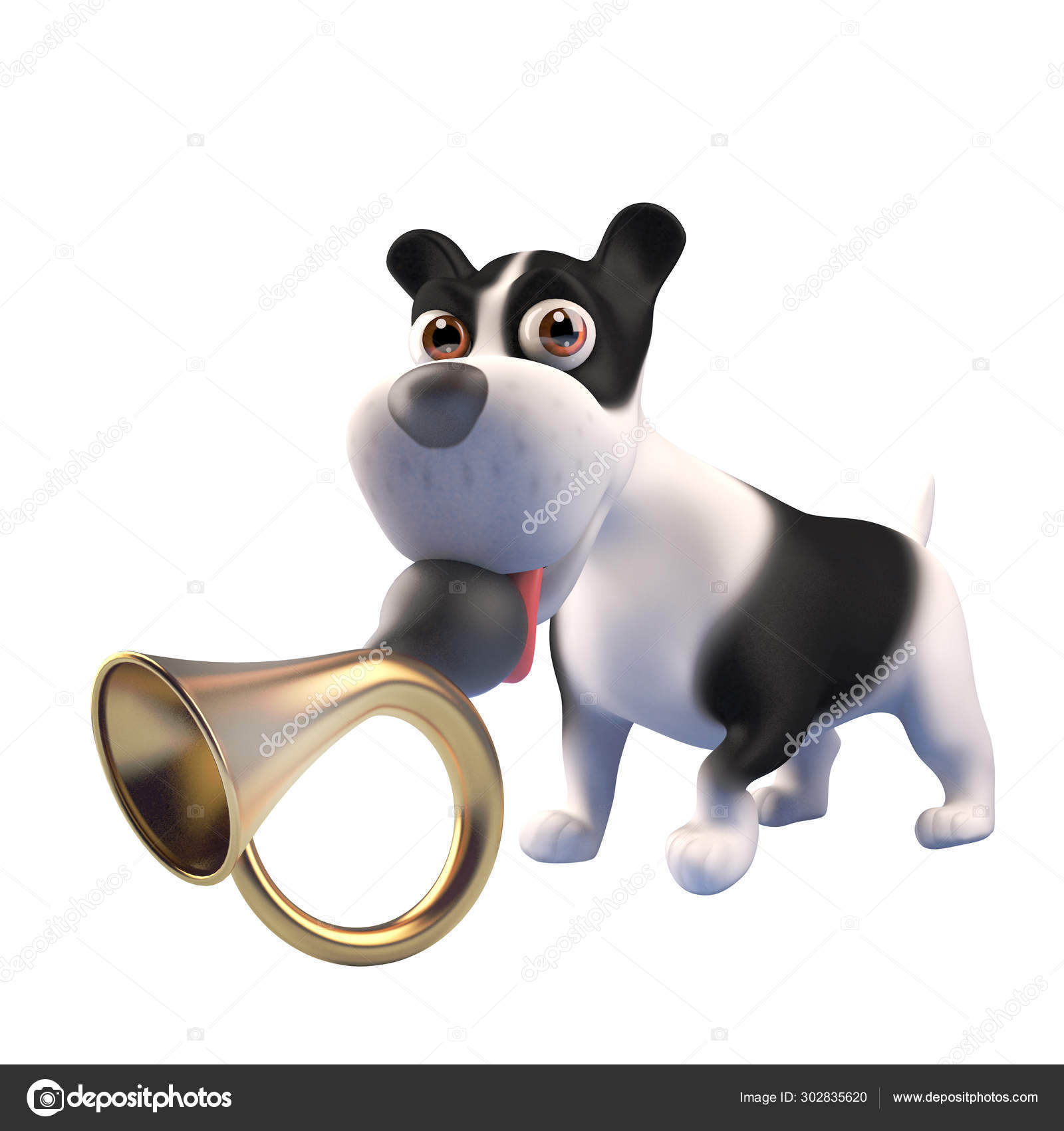 3d Funny Puppy Dog With Black And White Markings Holds An Old Car Horn In Its Mouth 3d Illustration Stock Photo C 3dalia