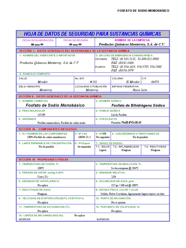 Hoja De Seguridad Msds Fosfato Monobasico De Sodio Identificacion Efectos Para La Salud Pdf Descargar Libre