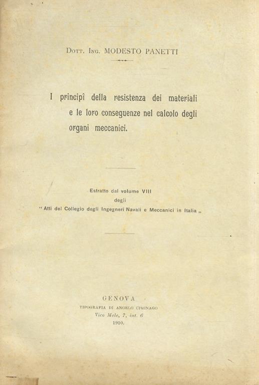 I Principi Della Resistenza Dei Materiali E Le Loro Conseguenze Nel Calcolo Degli Organi Meccanici Modesto Panetti Libro Usato Nd Ibs