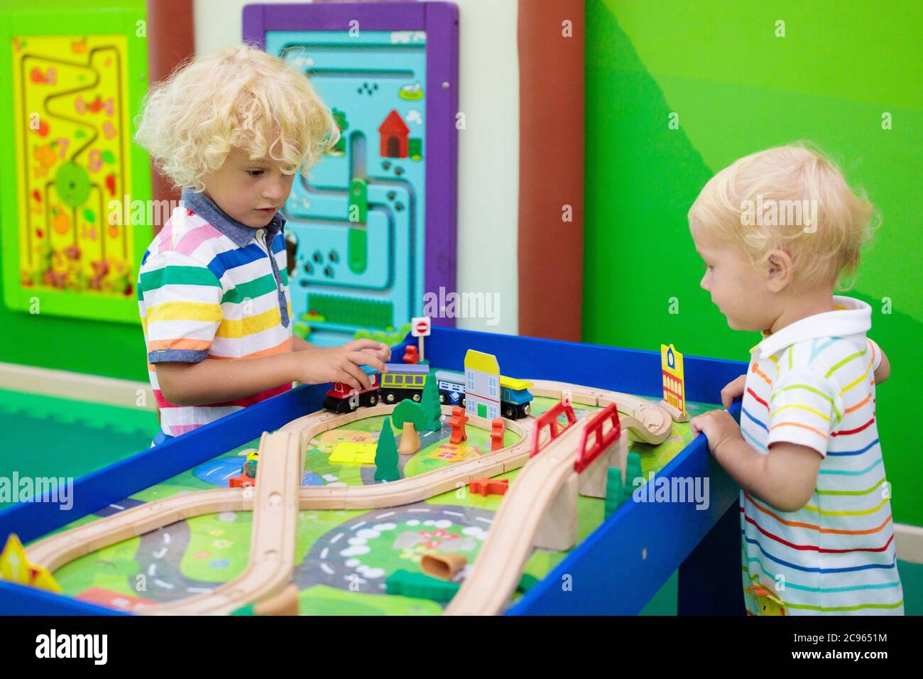 Kids Play Toy Railroad Little Blond Curly Boy With Wooden Trains In Indoor Playground Or Amusement Center Child With Car And Train Toys At Home Or D Stock Photo Alamy