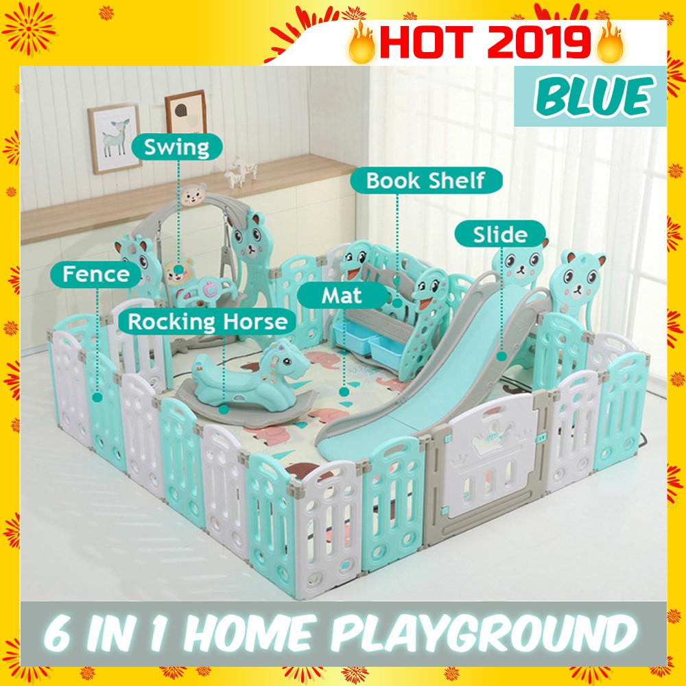 Bqt 6 In 1 Home Indoor Playground Slide Rocking Horse Swing Book Shelf And Mat With Foldable Baby Playpen Fence Shopee Malaysia