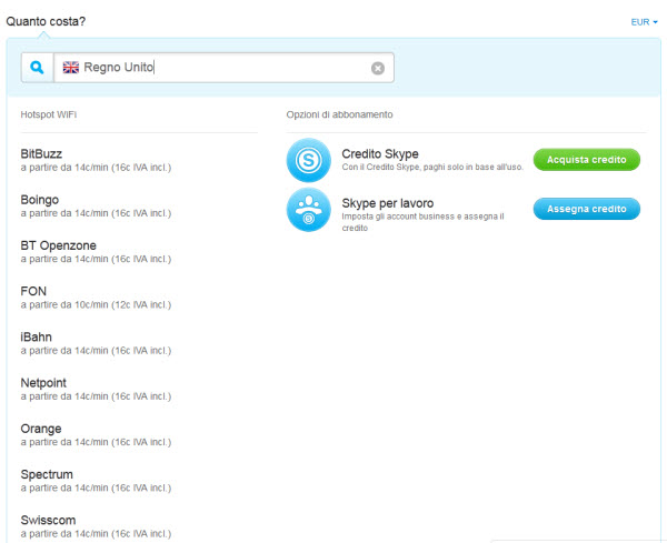 Skype Credit is a payasyougo plan for affordable local & international calling Call anywhere, send SMS & pay only when you use it. Skype for Business, precedentemente Lync 13, per Windows Phone estende ai dispositivi mobili le potenzialità di Lync e di Skype for Business, tra cui funzionalità voce e video tramite wireless, informazioni sulla presenza, messaggistica istantanea, conferenze e chiamate da un'unica interfaccia di facile utilizzo. Successivamente provvedi a ricaricare il tuo account Skype facendo clic sulla voce Aggiungi credito collocata nella parte in alto a sinistra, sotto il tuo nome, nella finestra di Skype In seguito pigia su Acquista Credito Skype ed attendi che venga aperta una nuova pagina nella finestra del browser Web impostato come predefinito sul suo.