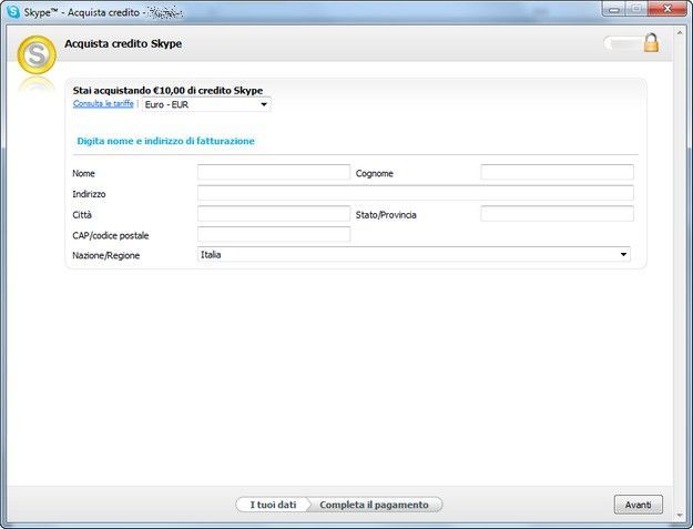 Il credito verrà erogato al Cliente secondo la stessa modalità di pagamento (per gli acquisti con carta di credito, l'importo verrà accreditato sulla carta di credito originale) Offerta limitata a 5 dispositivi totali per cliente idoneo durante il Periodo di validità dell'offerta e a un massimo di un adeguamento del prezzo per dispositivo. Aunque no lo creas, existe una. Per acquistare credito su Skype, collegati a questa pagina del sito Internet di Skype e clicca sul pulsante verde Acquista credito Skype Successivamente, metti il segno di spunta accanto al taglio della ricarica che vuoi acquistare (10,00 euro o 25,00 euro),.
