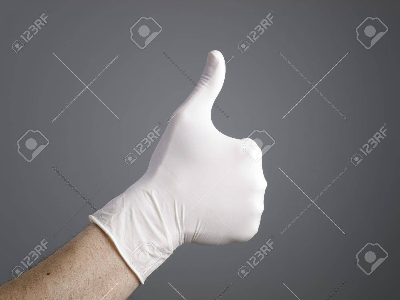 Immagini Stock Mano Con Un Guanto Di Lattice Che Esprime Positivita Su Sfondo Scuro Image