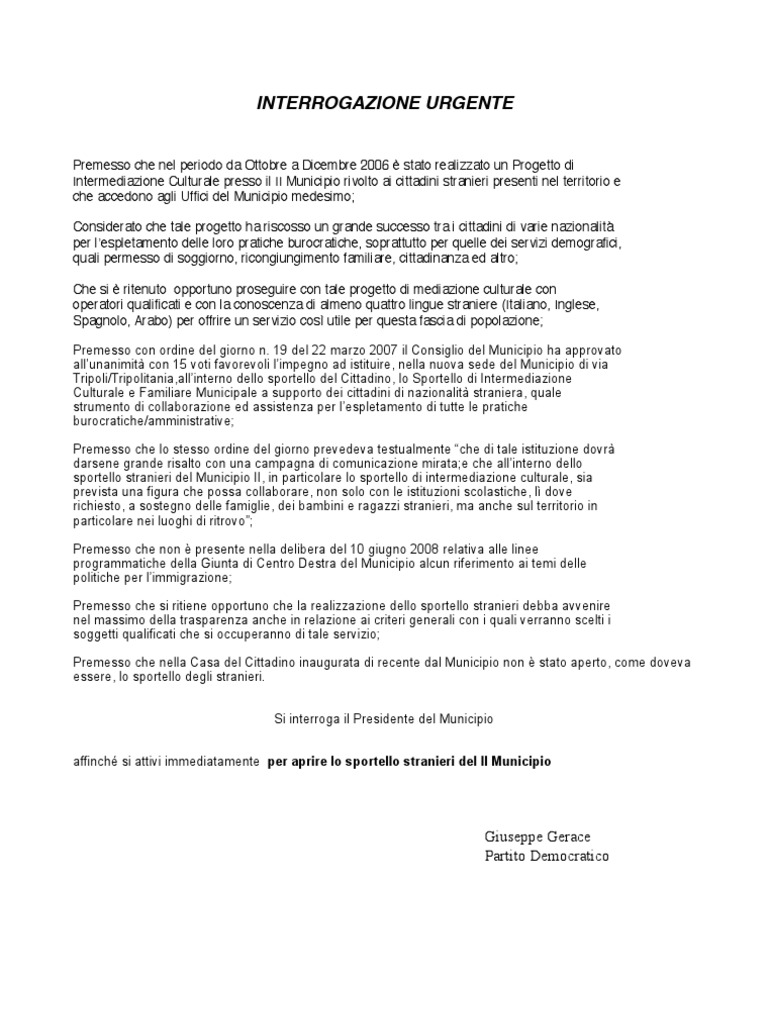 Interrogazione Urgente Giuseppe Gerace Partito Democratico
