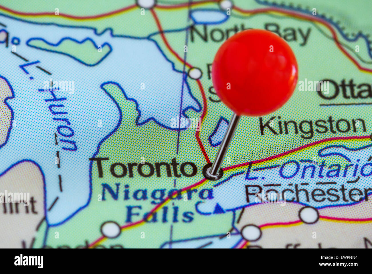 Blu Tack Sulla Mappa Con Lente Di Ingrandimento Cercando In Toronto La Capitale Della Provincia Di Ontario Canada Foto Stock Alamy