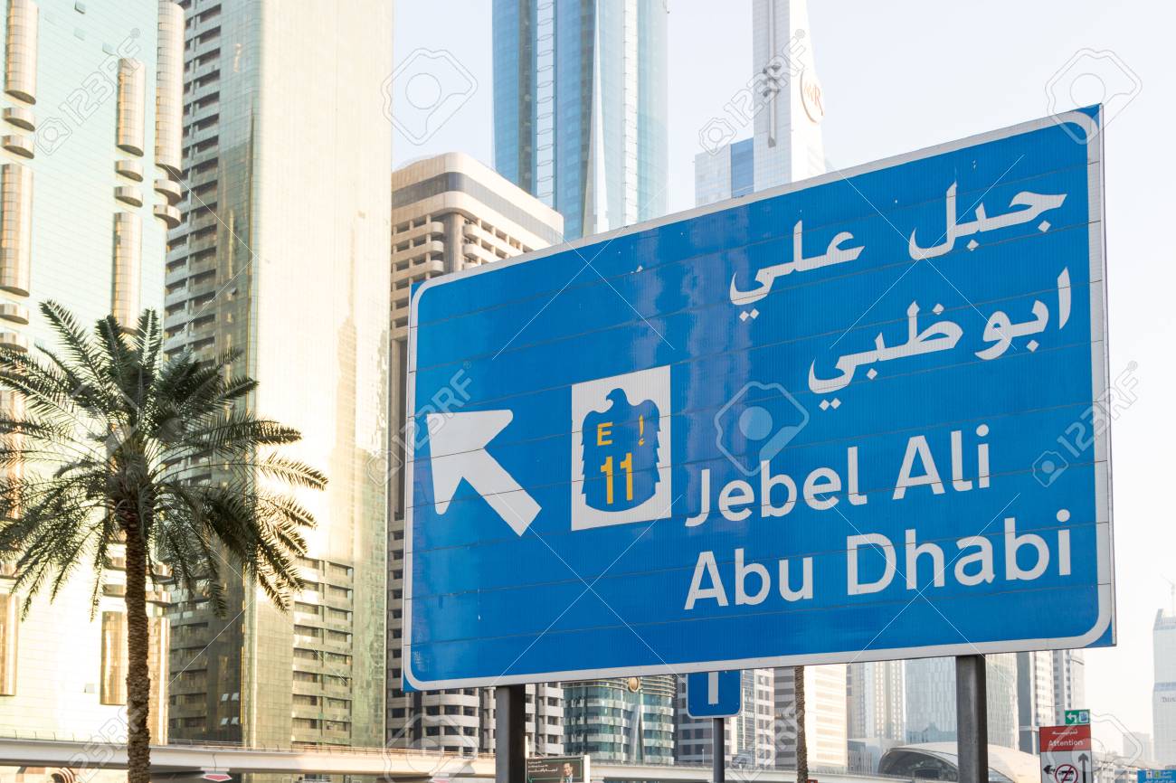 Road Sign In Dubai With Jebel Ali And Abu Dhabi Directions Stock Photo Picture And Royalty Free Image Image