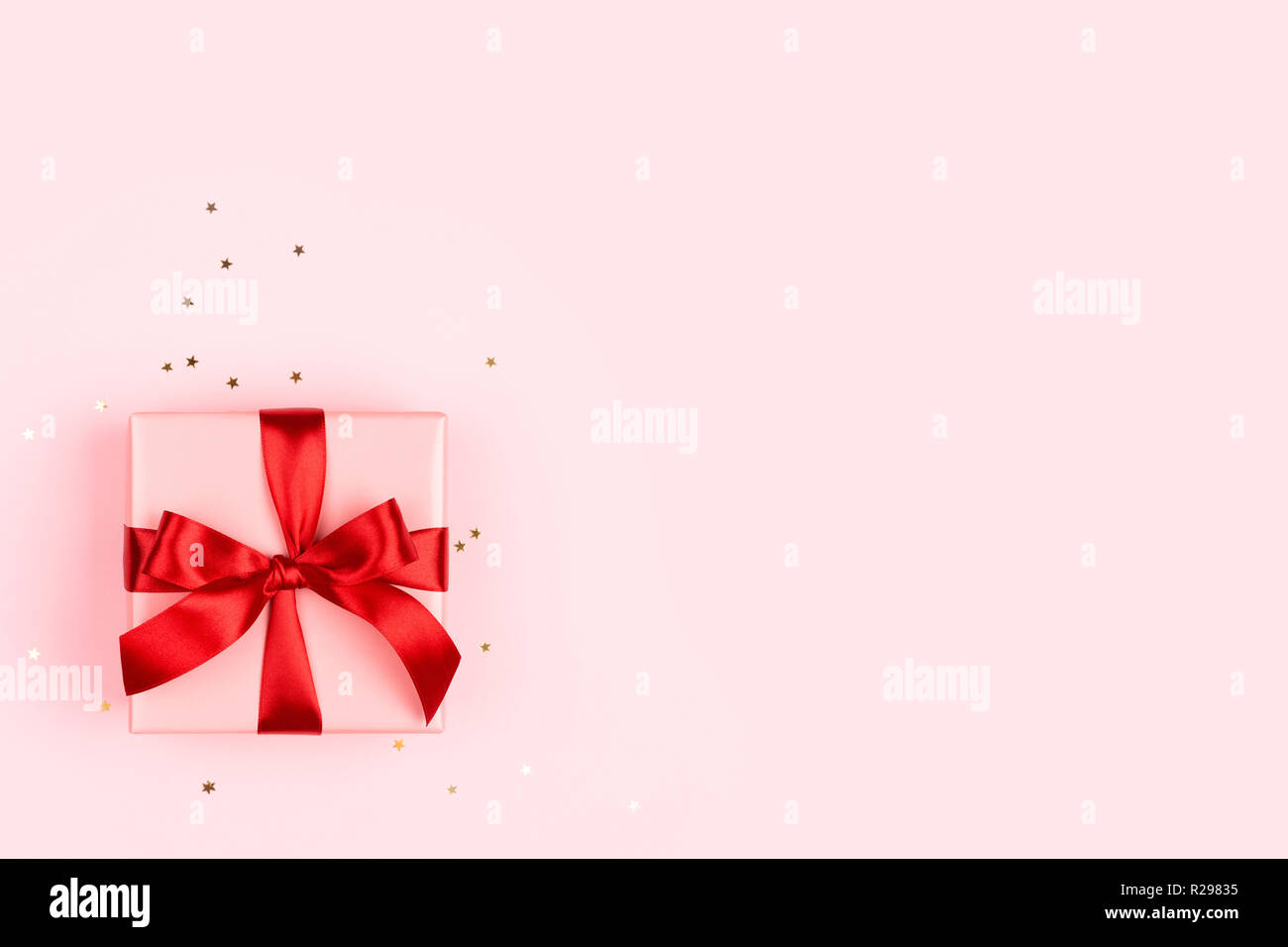 La Rosa Confezione Regalo Con Fiocco Rosso Su Sfondo Rosa Con Brillantini Dorati In Stile Minimale Holiday Card Con Copia Spazio Foto Stock Alamy