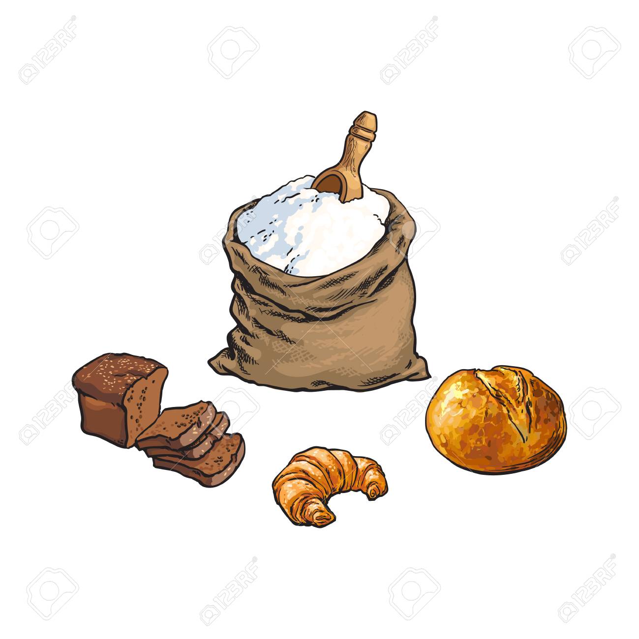 Esboco Vetorial De Farinha De Desenhos Animados Ou Sacola Ou Saco De Sacos De Acucar Com Colher De Madeira Pao Branco Pao Escuro E Croissant Ilustracao Isolada Em Um Fundo Branco Menu