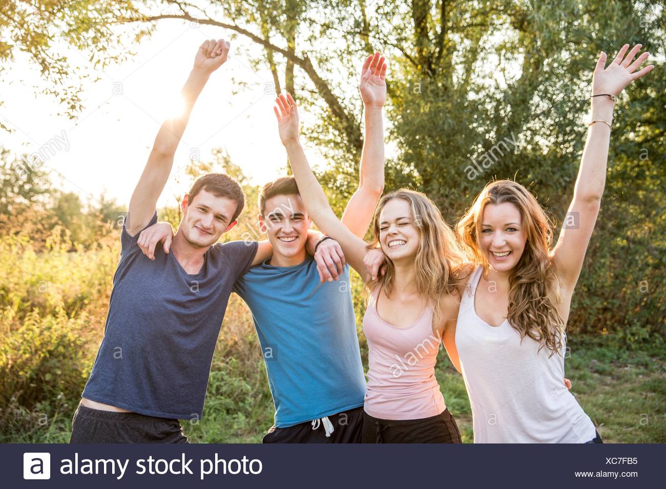 Portrait Of Group Of Friends In Rural Environment Arms Raised Smiling Stock Photo Alamy