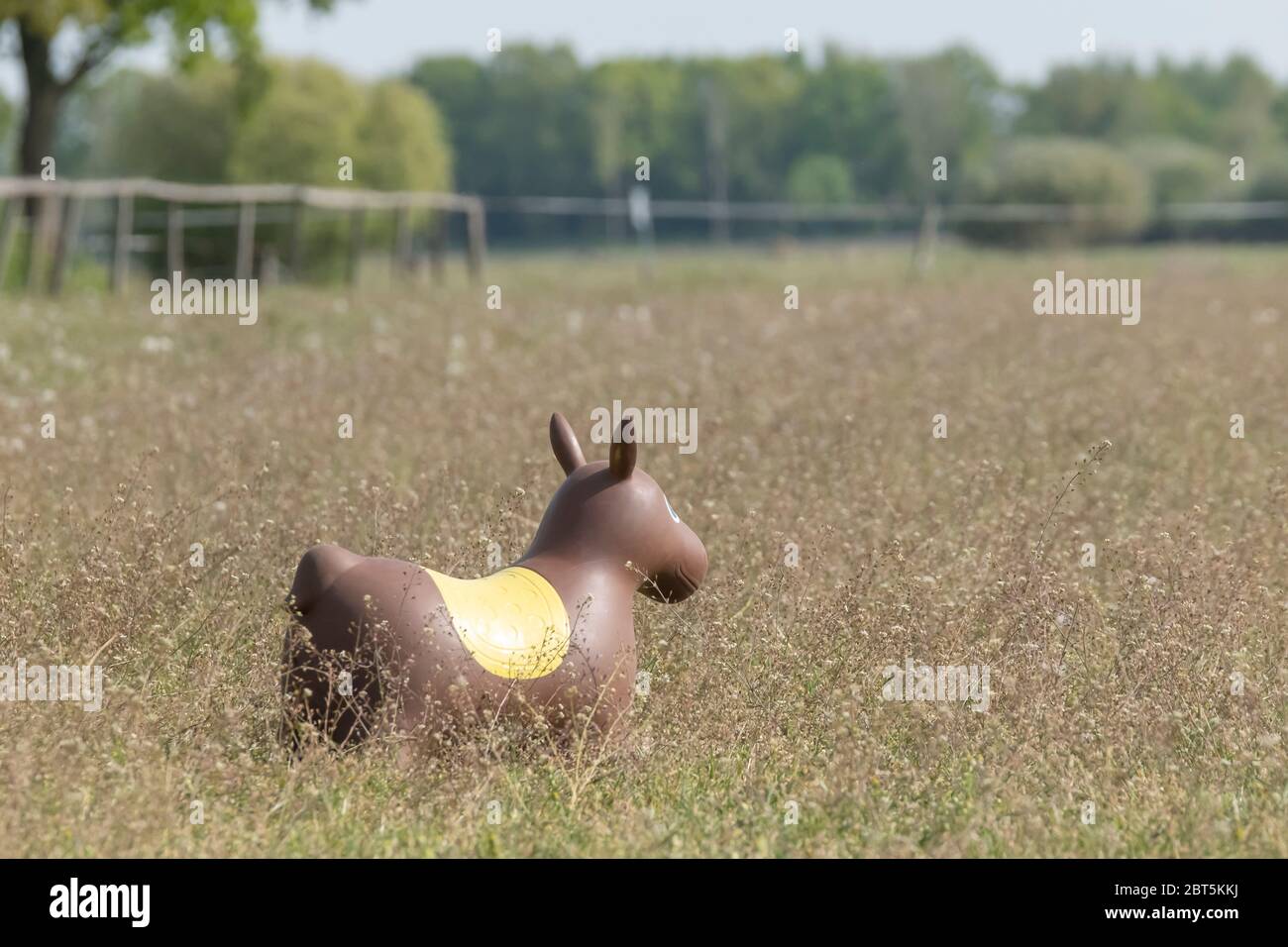 Giocattolo Gommato Gonfiabile Per Animali Da Cavallo E In Campo Un Cavallo Marrone Con Sella Gialla Foto Stock Alamy
