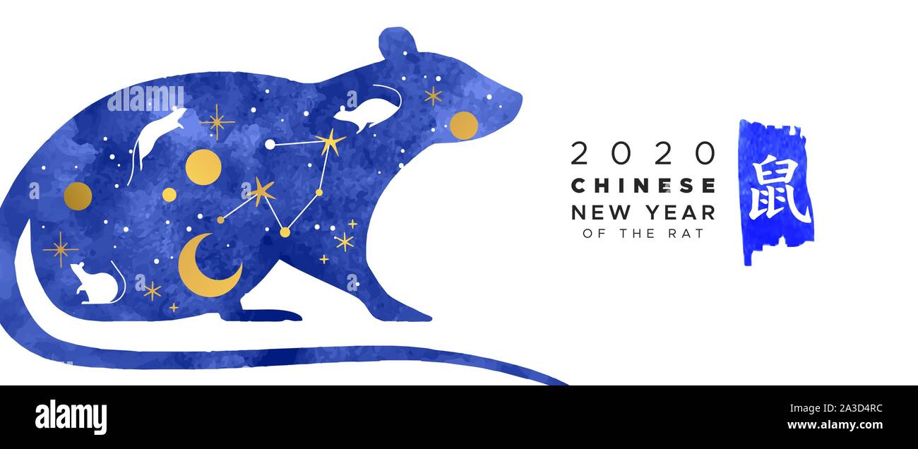 Il Capodanno Cinese Banner Illustrazione Di Blu Mouse Acquerello Animale Con Moderna Astrologia Oro Doodle Icone Simbolo Di Calligrafia Traduzione Rat Immagine E Vettoriale Alamy