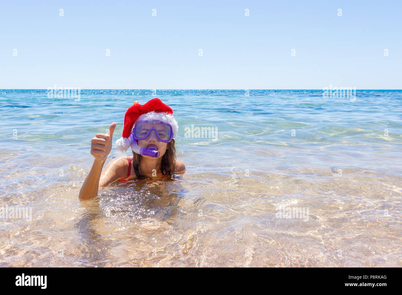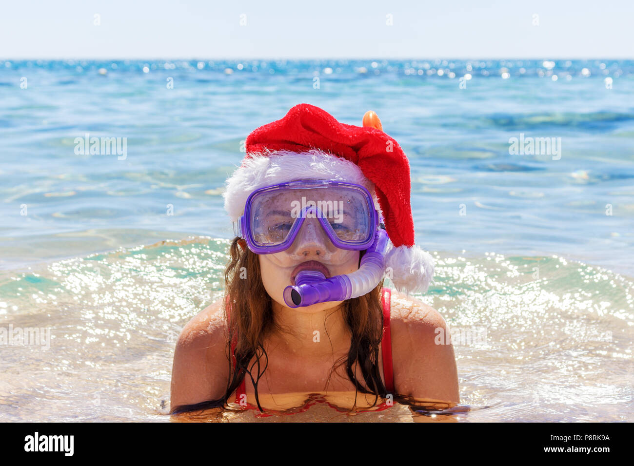 Spiaggia Di Vacanze Divertenti Donna Che Indossa Una Maschera Tubo E Cappello Di Natale Per Il Nuoto In Acque Oceaniche Close Up Ritratto Di Una Ragazza La Vacanze Di Viaggio Foto Stock