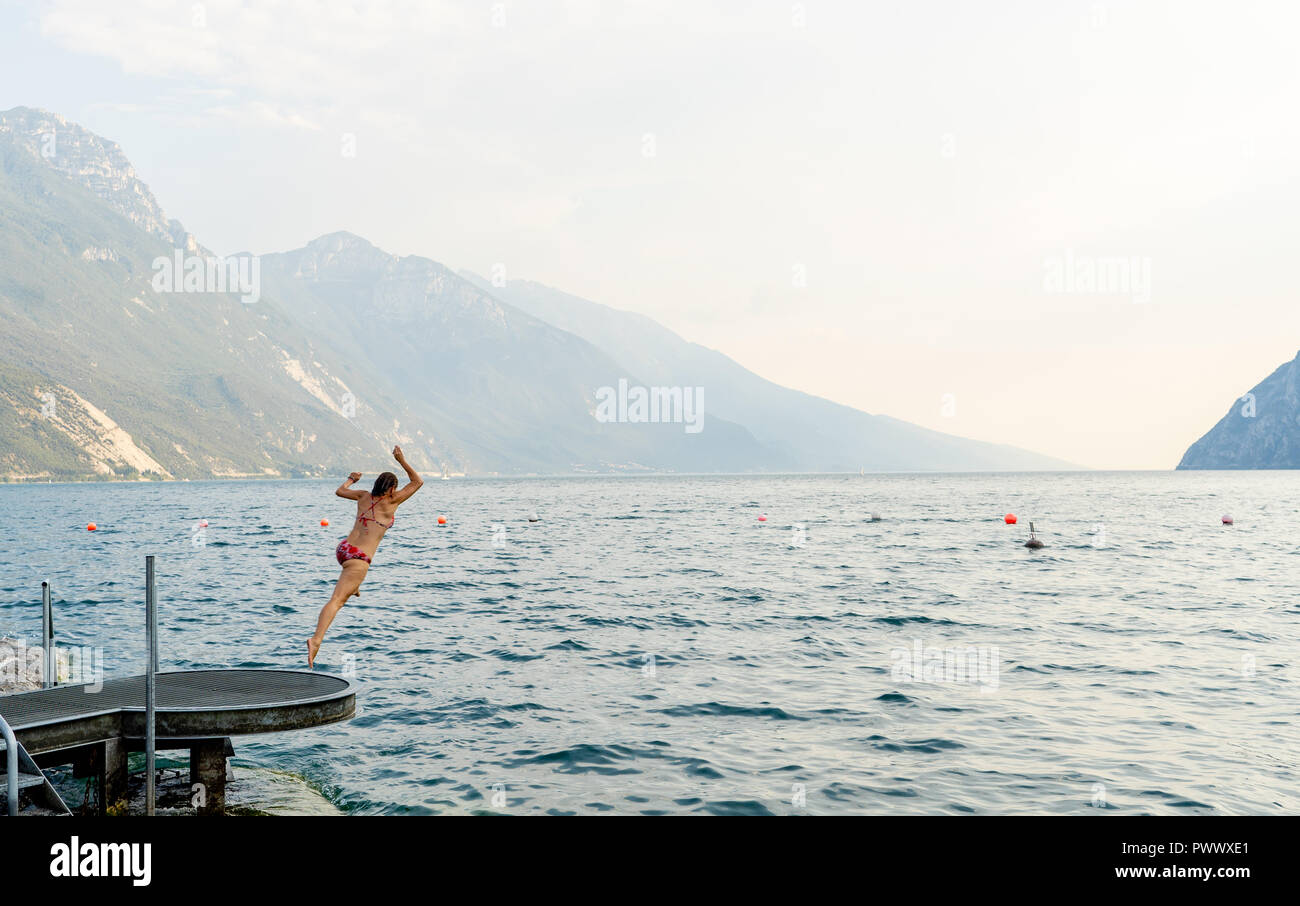 Donna Attraente Divertirsi Saltando In Acqua Nel Lago Di Garda In Italia In Estate Vacanze Vacanze Divertenti Dei Viaggi In Europa Foto Stock Alamy