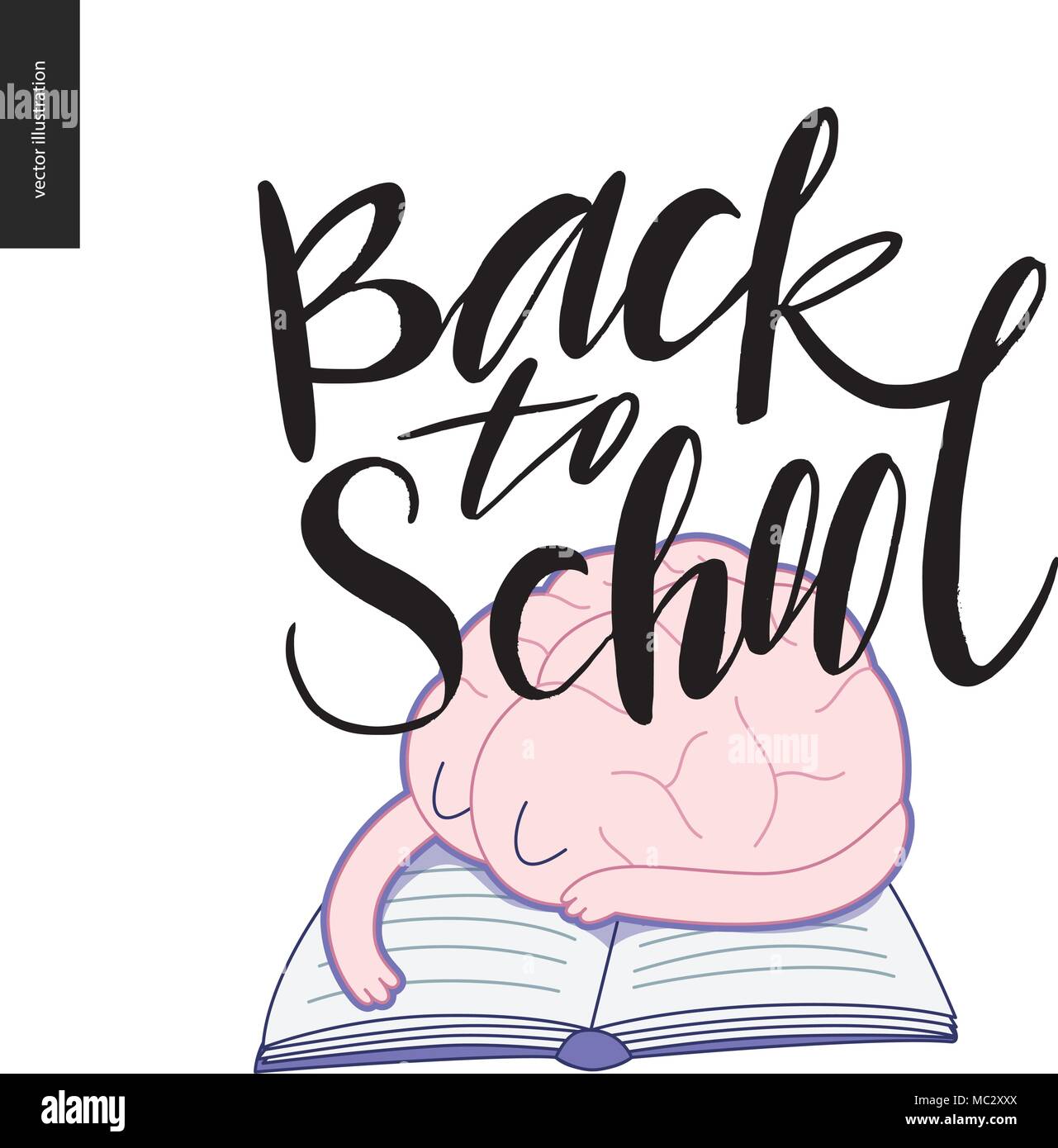 Si Torna A Scuola Spazzola Di Inchiostro Scritte A Mano Vettore Di Piana Cartoon Illustrazione Di Un Cervello Stanco Di Dormire Sul Libro Aperto Immagine E Vettoriale Alamy