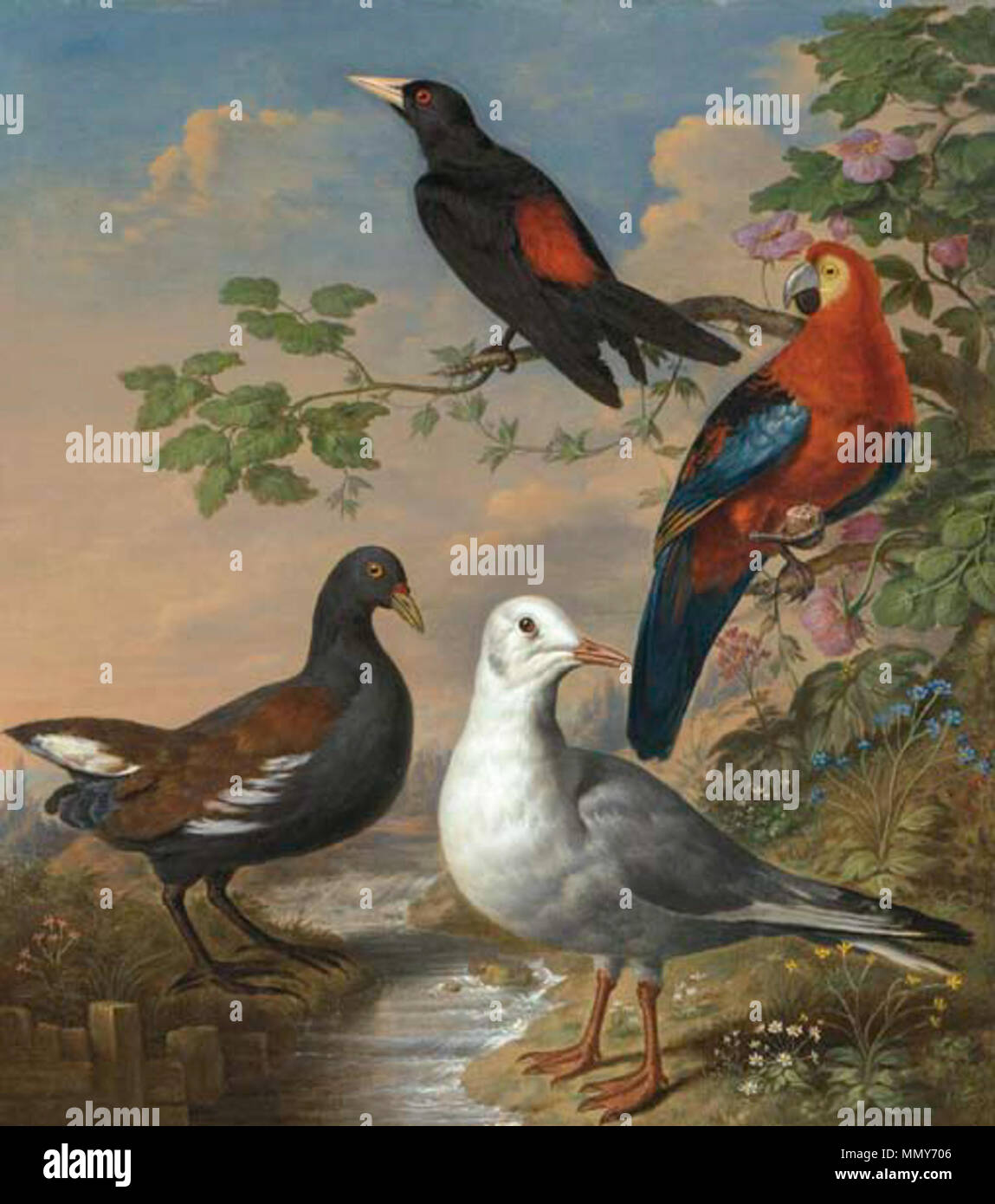 Inglese Un Moorhen Un Gabbiano Un Scarlet Macaw E Red Rumped Un Cacique Da Un Flusso