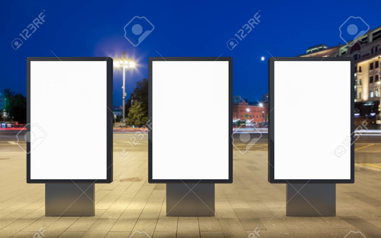 Immagini Stock Tre Cartelloni Pubblicitari In Bianco Nella Citta Di Notte Isolato Con Il Percorso Di Clipping Attorno Alla Visualizzazione Pubblicitaria Illustrazione 3d Image