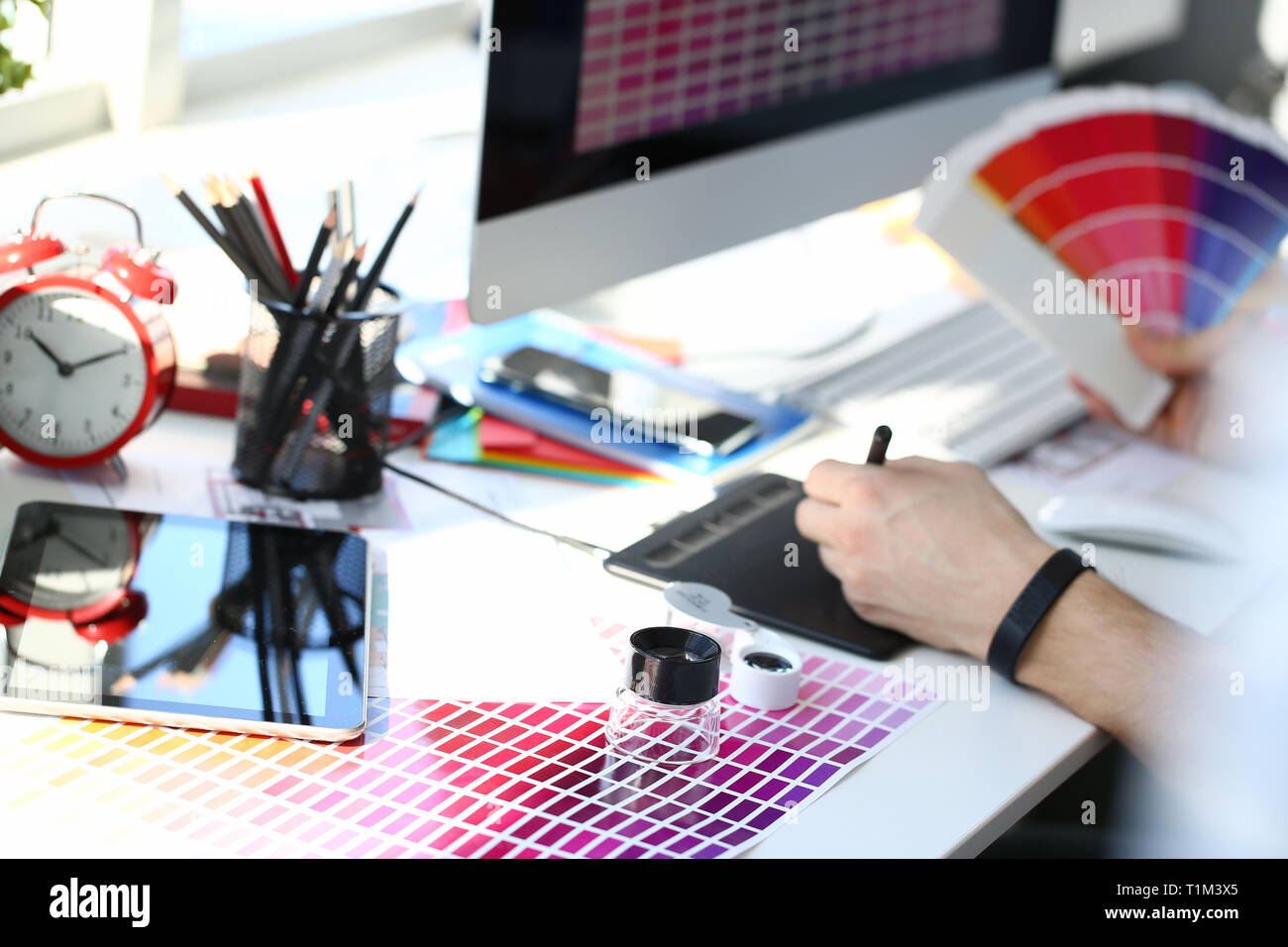Prova Di Stampa Pagina Di Carta Con Colore Test Design Fiocco E Lente Di Ingrandimento Foto Stock Alamy