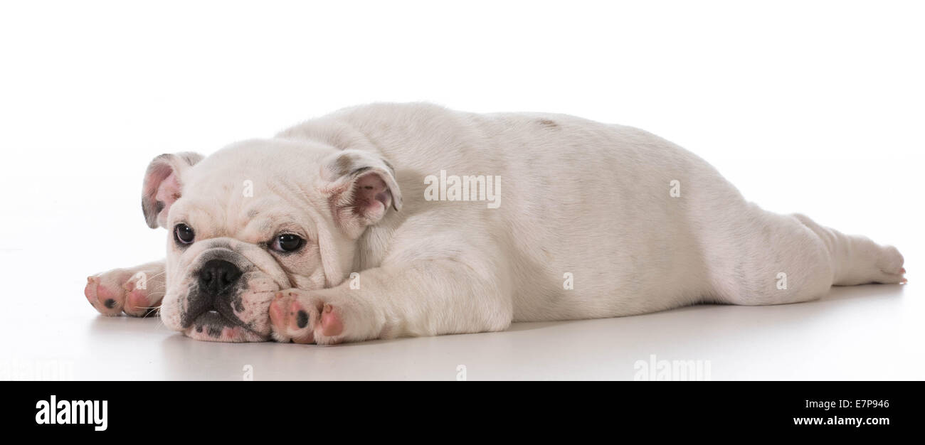 Stanco Bulldog Inglese Cucciolo Che Stabilisce Le Stese Su Sfondo Bianco Foto Stock Alamy