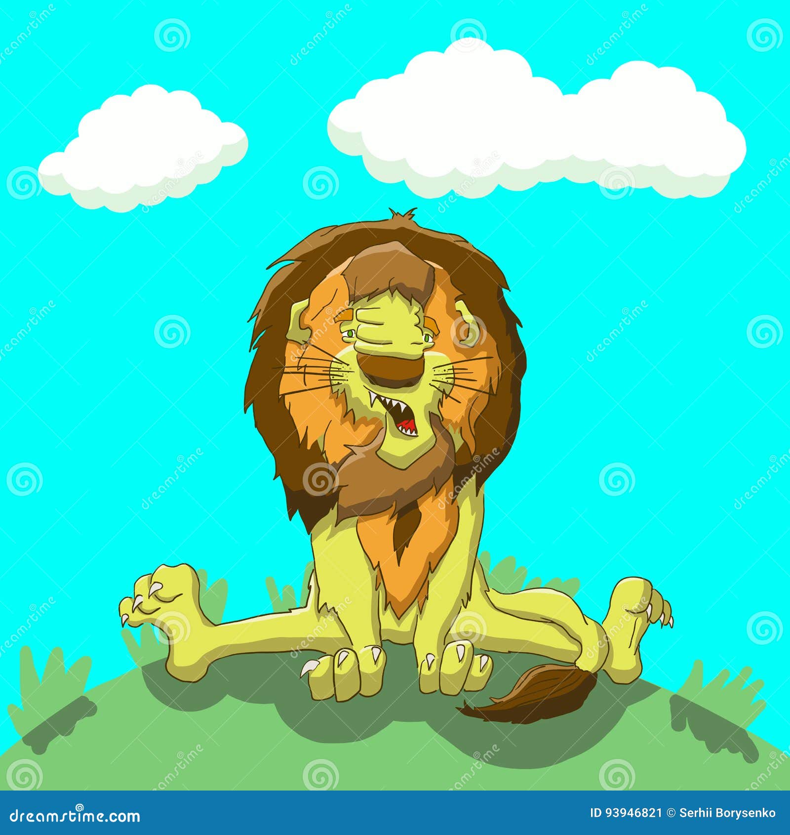 Leone Stanco Che Si Siede Sul Prato Inglese Illustrazione Di Stock Illustrazione Di Mane Colore