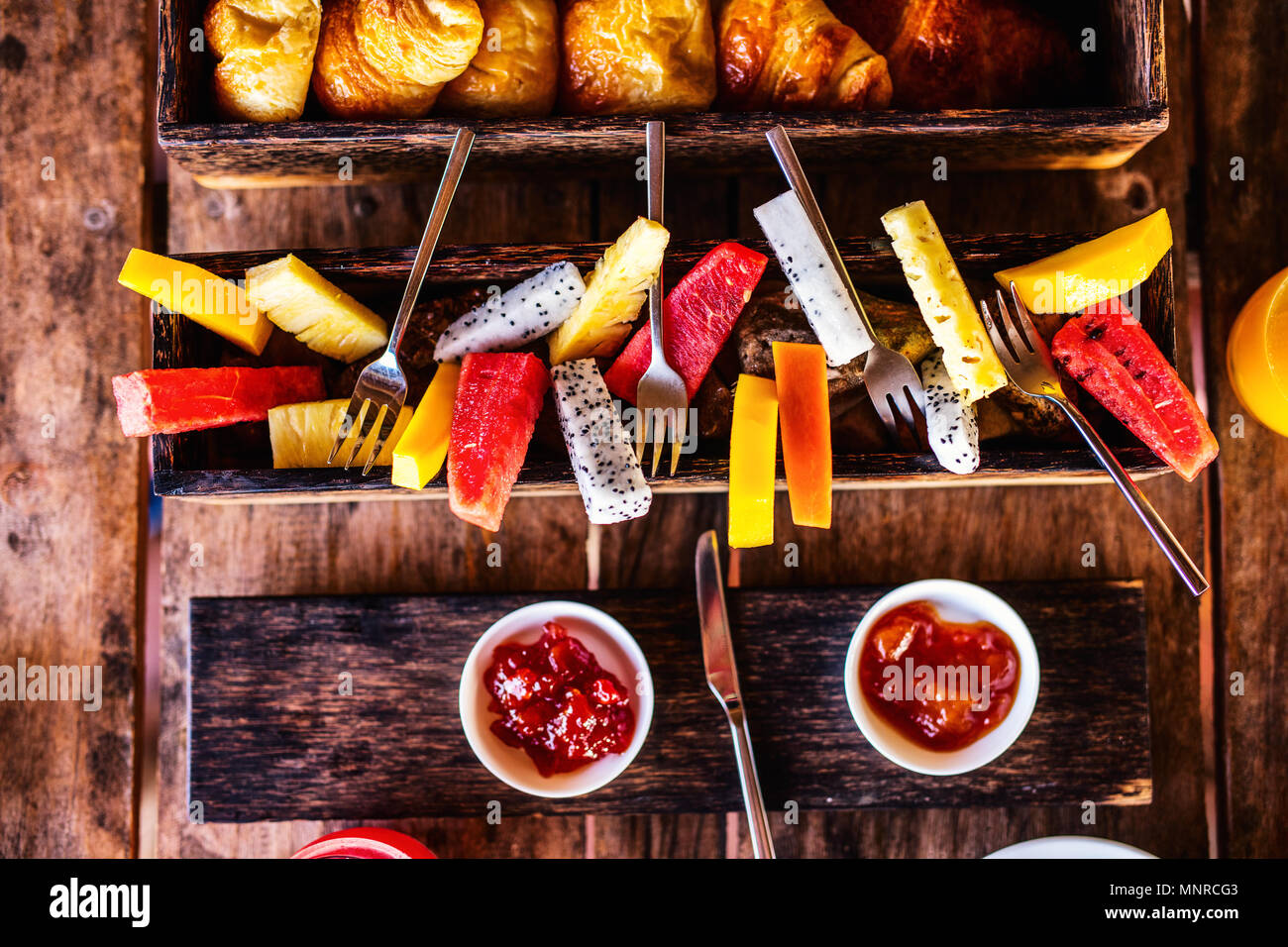 Vista Superiore Del Delizioso Cibo Organico Serviti Per Colazione Sulla Tavola In Legno Rustico Frutta Succo Di Frutta Croissant E Marmellata Laici Piana Foto Stock Alamy