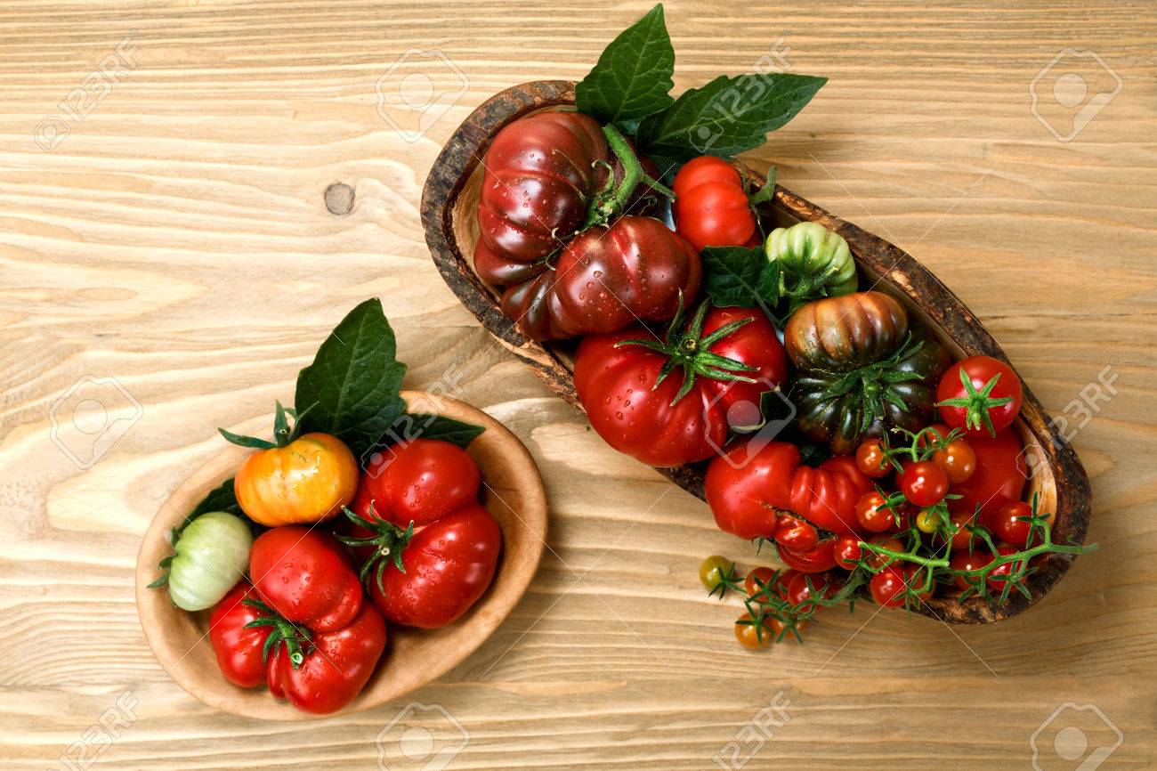 Immagini Stock Biodiversita Heirloom Pomodori Freschi Sulla Tavola Di Legno Distesi Sopra La Vista Cibo Organico Image