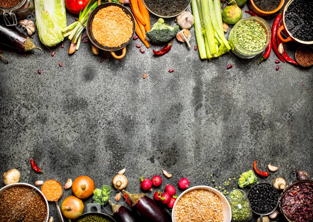Immagini Stock Cibo Organico Una Varieta Di Legumi Con Verdure Su Fondo Rustico Image