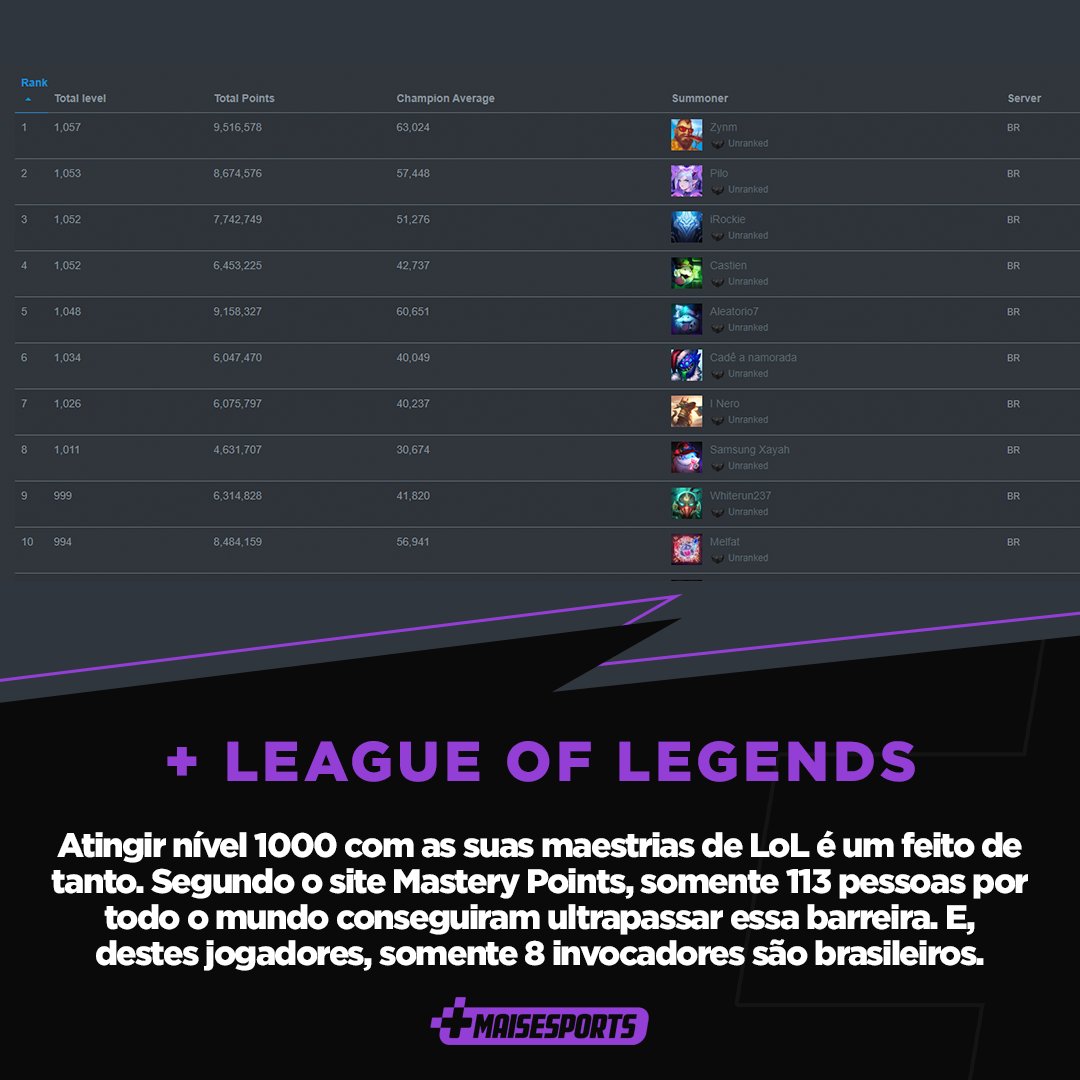 Dar aos jogadores um novo sistema de progressão além da Maestria e das ranqueadas Recompensar jogadores com benefícios únicos quando obtiverem sucesso Com isso em mente, convidamos alguns jogadores até a Riot para nos ajudar a decidir alguns detalhes Um exemplo disso trabalhamos com jogadores para encontrar o equilíbrio certo entre. League of Legends é um jogo em equipes com mais de 140 Campeões com os quais você pode fazer jogadas insanas Jogue agora, é grátis!. Apenas 12 jogadores pelo mundo conseguiram alcançar nível 7 de maestria com todos os campeões do LoL — e só um deles é brasileiro!.