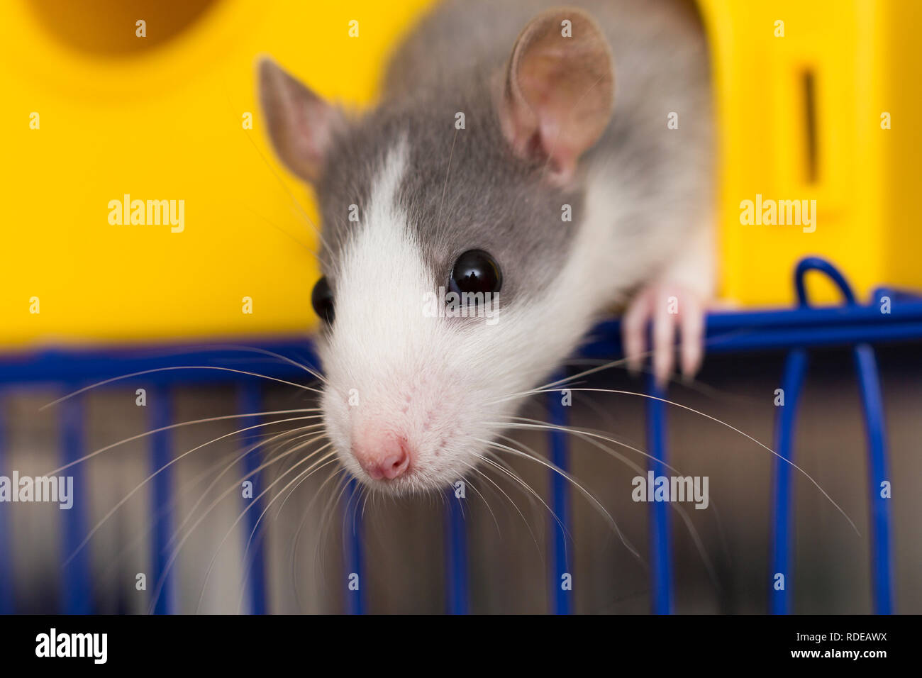 Testa Ritratto Del Bianco E Del Grigio Topo Tame Criceto Con Lucidi Occhi Guardando Dal Colore
