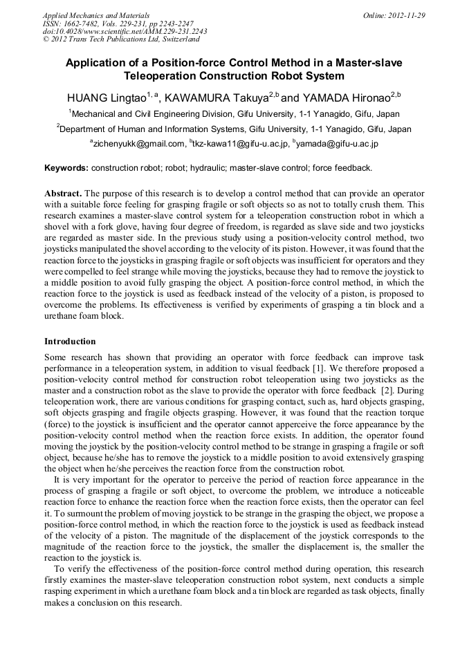 Application Of A Position Force Control Method In A Master Slave Teleoperation Construction Robot System Scientific Net