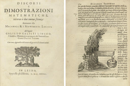 Del signor Galileo Galilei Linceo Con vna appendice del centro di grauità d'alcuni solidi Inleida, appresso gli Elsevirii, M D C XXXVIII "Reissued July, 1933". Discorsi e dimostrazioni matematiche, intorno due nuove scienze attenenti alla mecanica & i movimenti locali Leiden Elzevier Press, 1638 4o (199 x 148 mm) Text of the dialogues in italic type, formal proofs in Roman type, errata leaf at end, printers' woodcut device on title, numerous woodcut illustrations and diagrams in text, letterpress. DISCORSI E DIMOSTRAZIONI MATEMATICHE intorno a due nuove scienze attenenti alla mecanica & i movimenti locali ALLO ILLUSTRISSIMO SIGNORE IL SIGNORE CONTE DI NOAILLES Consiglier di sua Maestà Cristianissima, Cavalier dell'Ordine di Santo Spirito, Mariscalco de' suoi campi ed esserciti,.