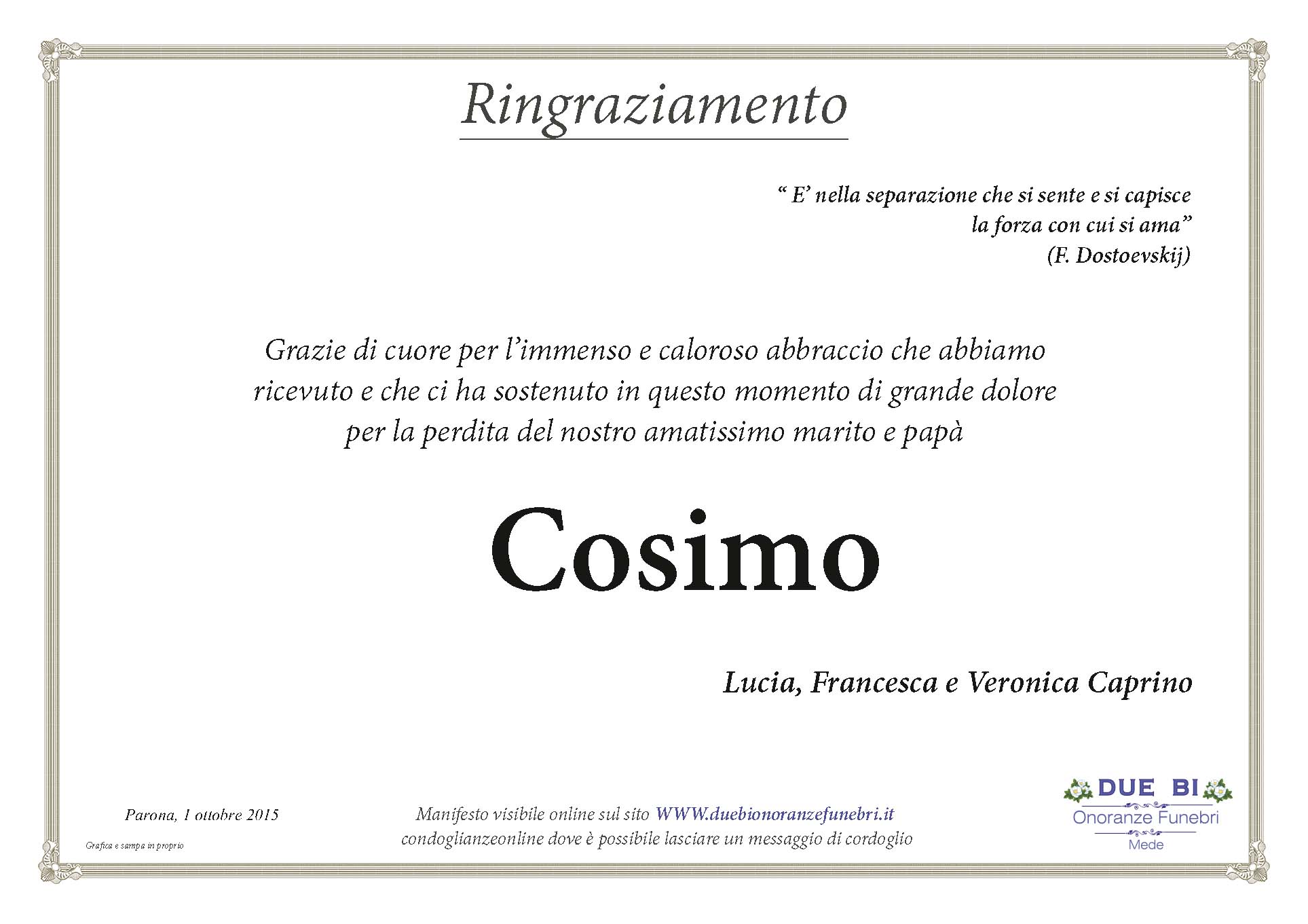 Condoglianzeonline It Il Portale Dedicato Ai Necrologi Caprino Cosimo Due Bi Onoranze Funebri