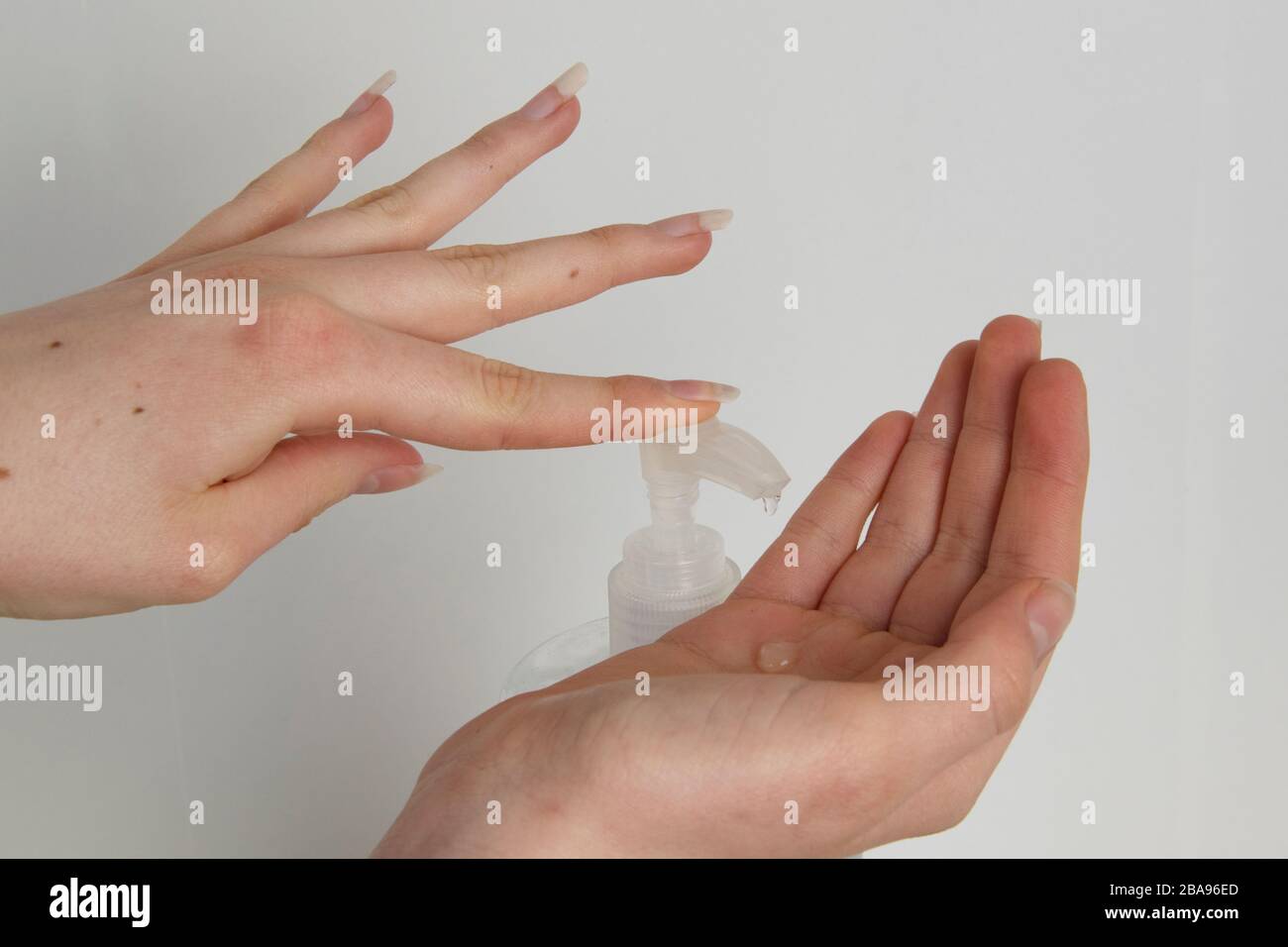 Primo Piano Della Donna Con Igienizzatore Per Mani Sfondo Bianco Unghie Lunghe Foto Stock Alamy