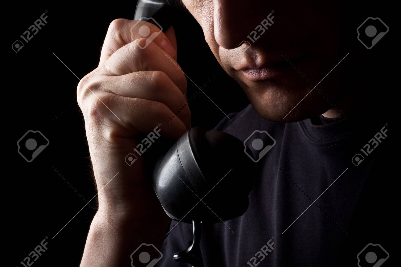 Immagini Stock L Uomo Parla Per Telefono Un Primo Piano Uno Sfondo Nero Image