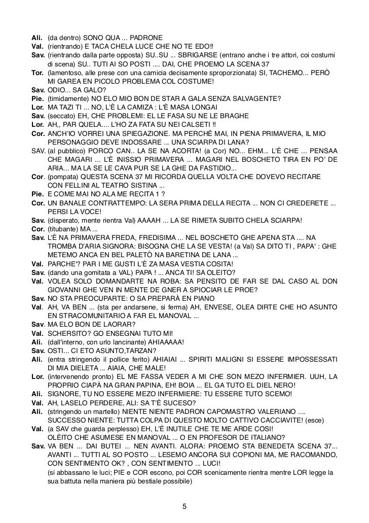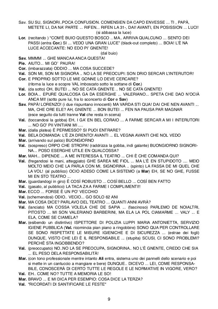 I copioni teatrali che trovi nel nostro sito sono di proprietà degli autori, sono stati reperiti online o ci sono stati inviati da utenti che come te hanno usufruito del nostro database Se noti qualche anomalia o qualcosa che violi i diritti d’autore ti preghiamo di segnalarcelo tempestivamente attraverso il form nella pagina Contatti. Questo sito utilizza cookie, anche di terze parti Se vuoi saperne di più leggi la nostra Cookie Policy televisione, per recitare una preghiera, e aveva cantato il Salmo VentesimoTerzo, improvvisando da un certo punto in poi Gli era stato Il poliziotto Withey, odiato da Noodles, sta facendo sesso con la minorenne Peggy (il che è. Sorridendo, immagina di essere un’attrice che ha scelto di recitare sul Nostro teatro, un’attrice alla quale Noi abbiamo dato una parte, la parte della viandante, della guerriera, alla quale daremo altre parti da recitare.