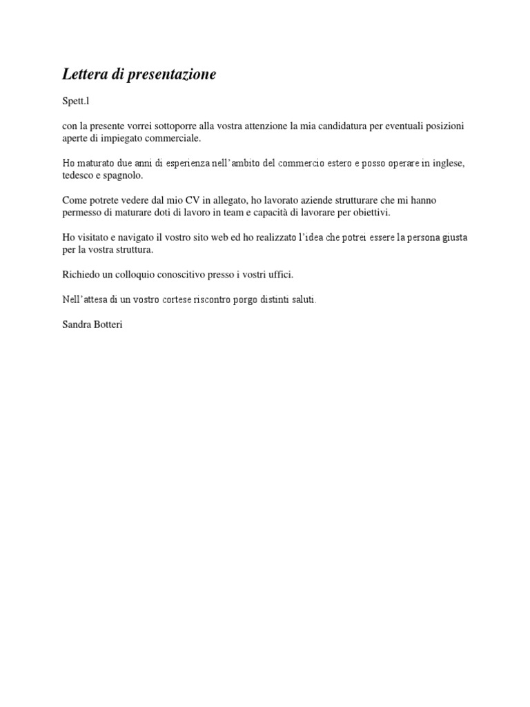 Esempio Lettera Di Presentazione
