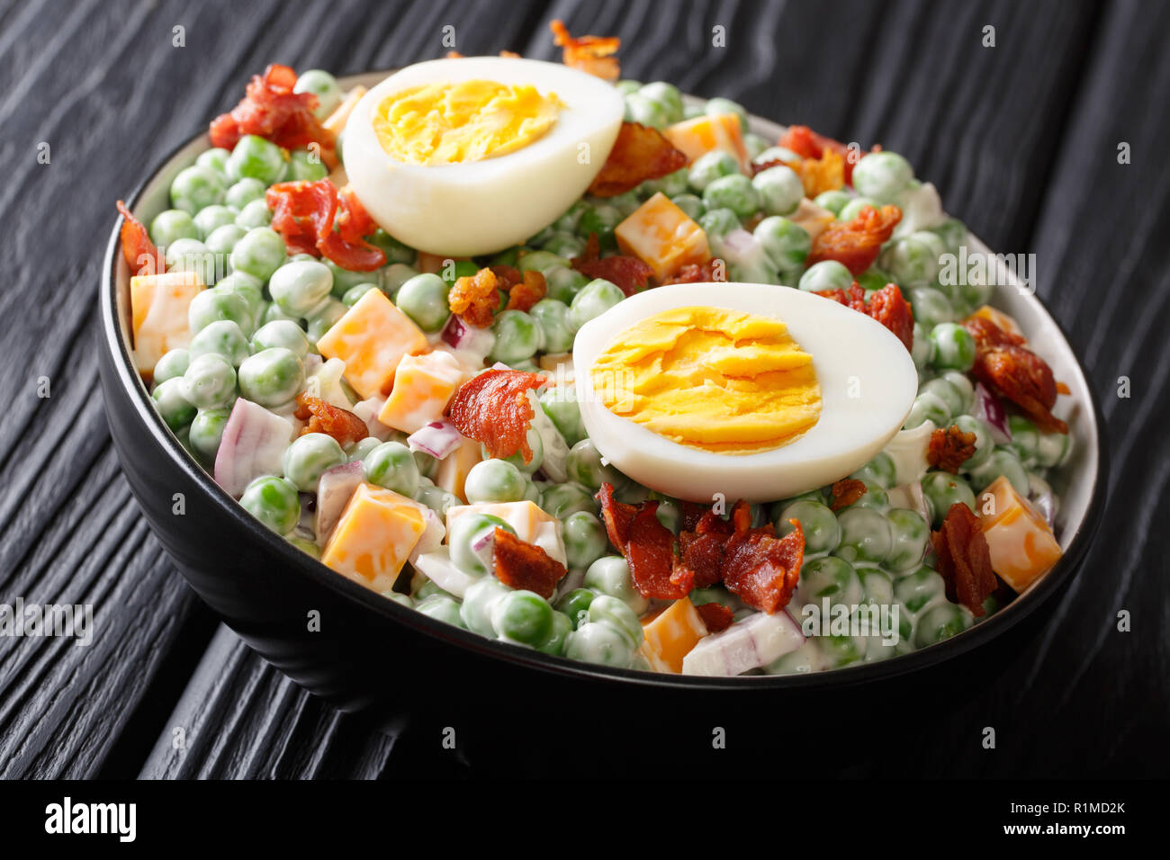 Inglese Pisello Verde Insalata Con Le Uova Sode Cipolla Pancetta E Formaggio Cheddar Con Salsa Alla Panna Closeup In Una Ciotola Sul Tavolo Orizzontale Foto Stock Alamy