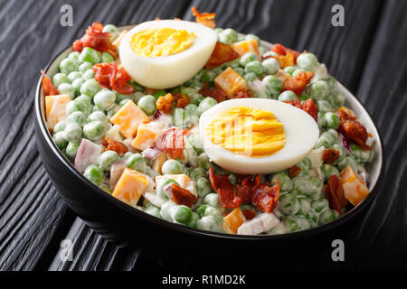 Inglese Insalata Di Pasqua Con Fresco Verde Piselli Uova Sode Pancetta E Formaggio Cheddar Con Salsa Di Close Up In Una Ciotola Sul Tavolo Orizzontale Foto Stock Alamy