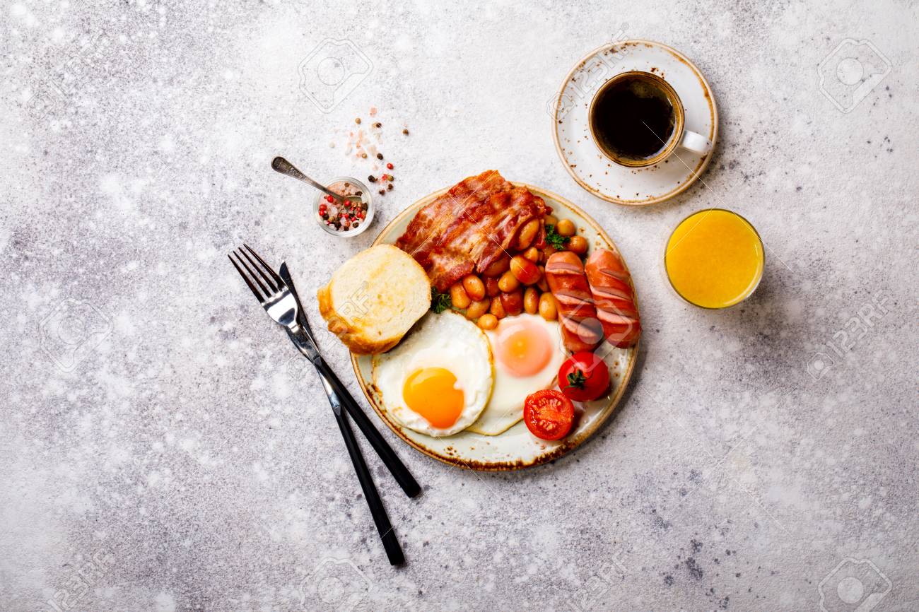 Immagini Stock Colazione Tradizionale Inglese Alimento Su Uova Di Pietra Salsicce Pancetta Fagioli Toast Caffe E Succo D Arancia Vista Dall Alto Image
