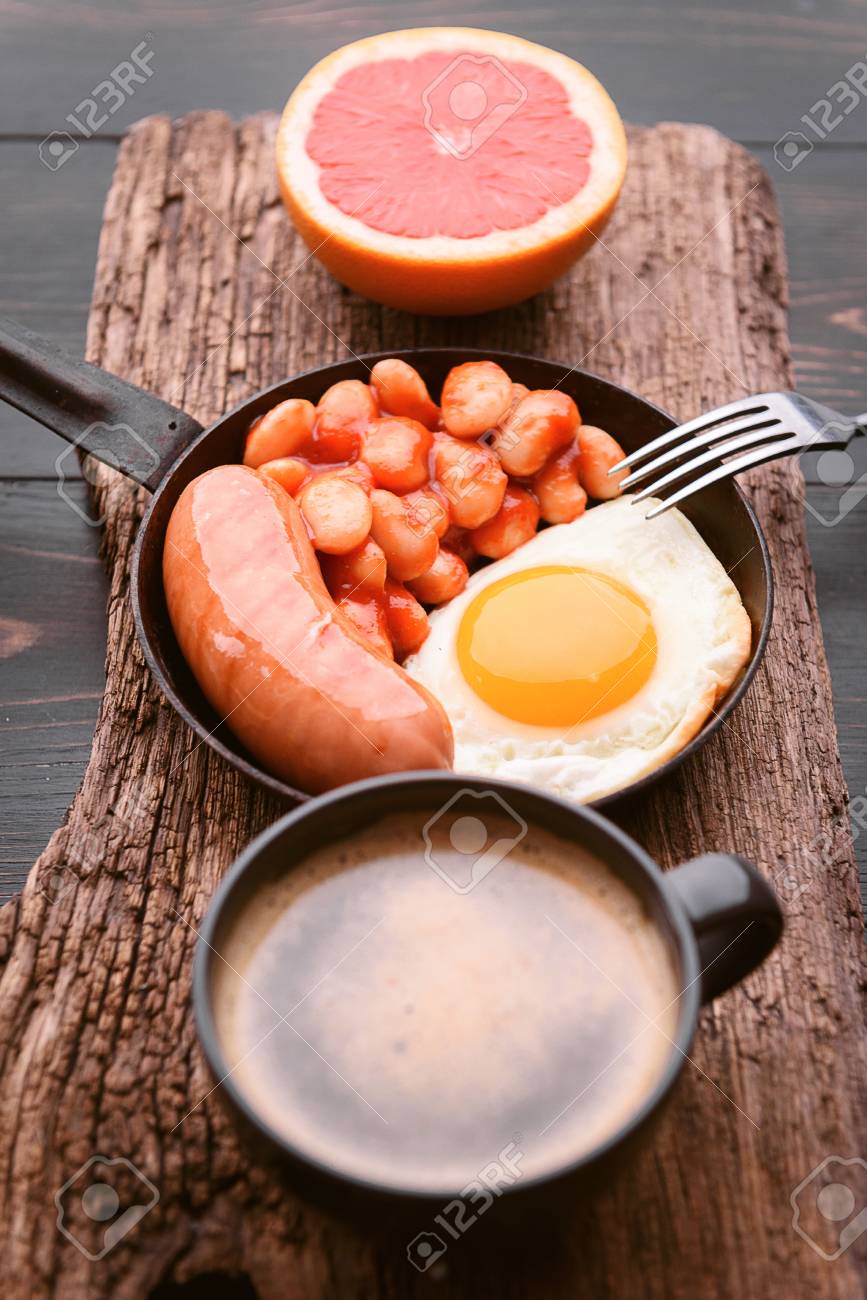 Immagini Stock Colazione Inglese Salsiccia Uova Fritte E Fagioli Al Pomodoro Caffe E Pane Nelle Vicinanze Image